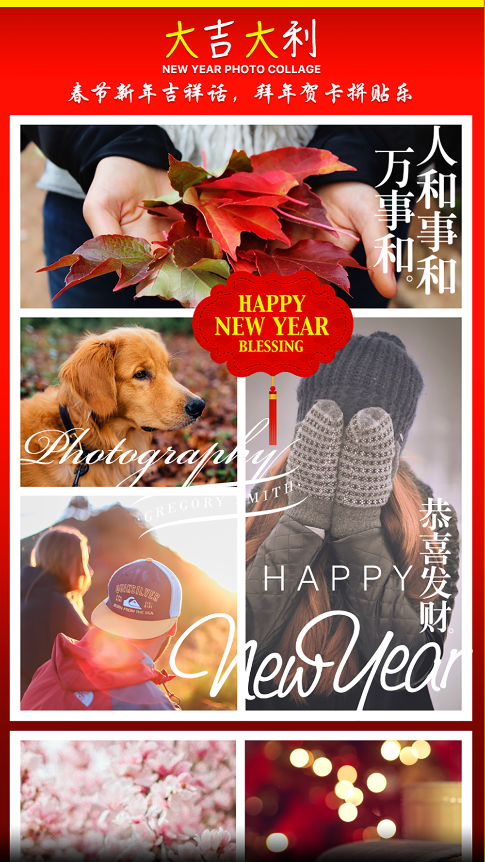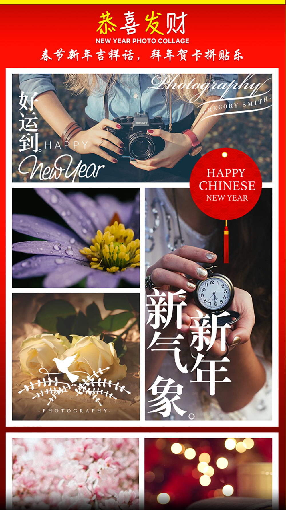 这是一款支持iMessage中文拜年贴纸包的中国新年贺卡拼贴应用,上百种的拼贴模板、滤镜、字体、贴纸等着您来选用搭配,将您的新年祝福或春节旅游等美好时光化成一张张的相片贺卡送给亲朋好友吧!