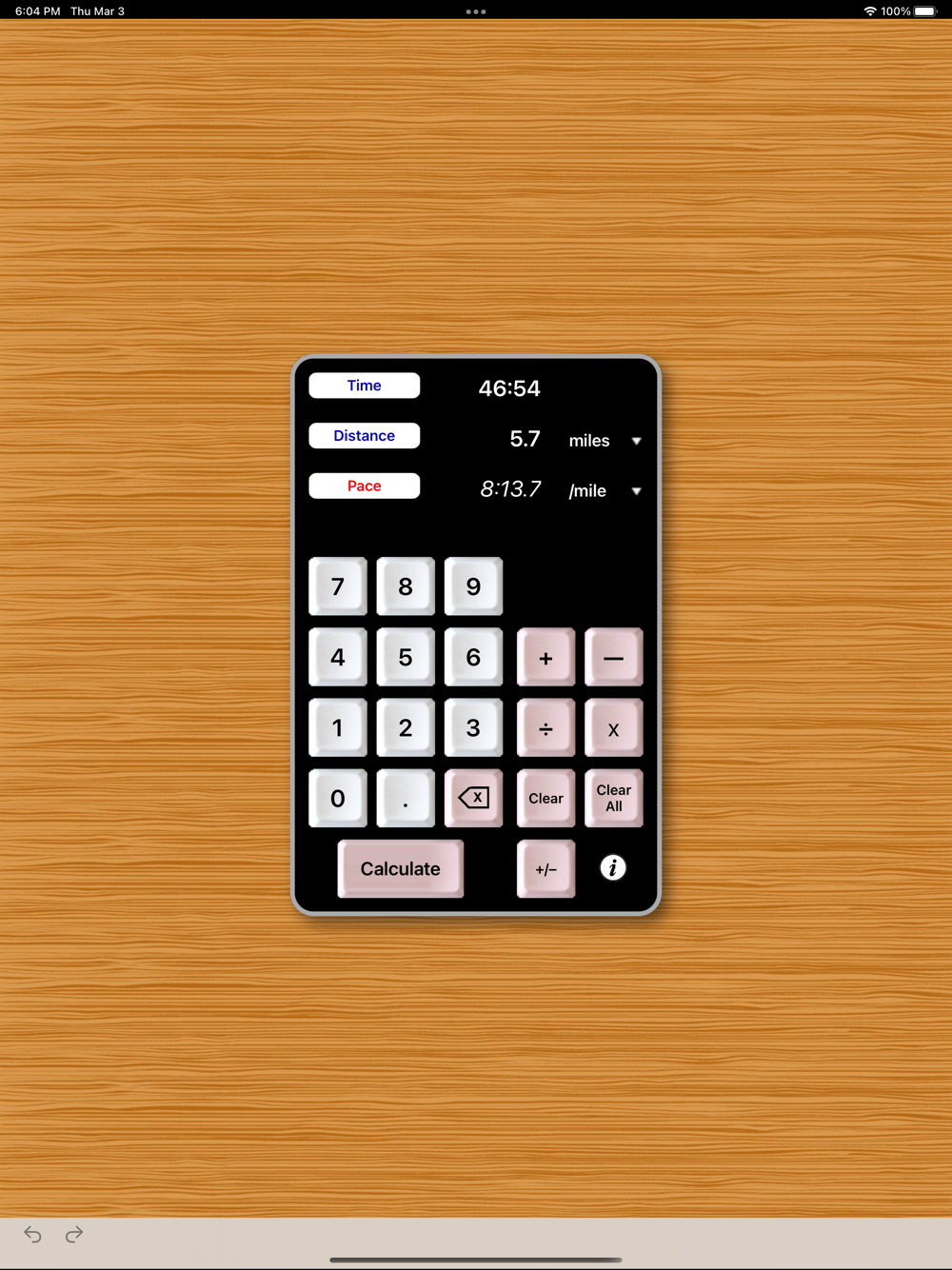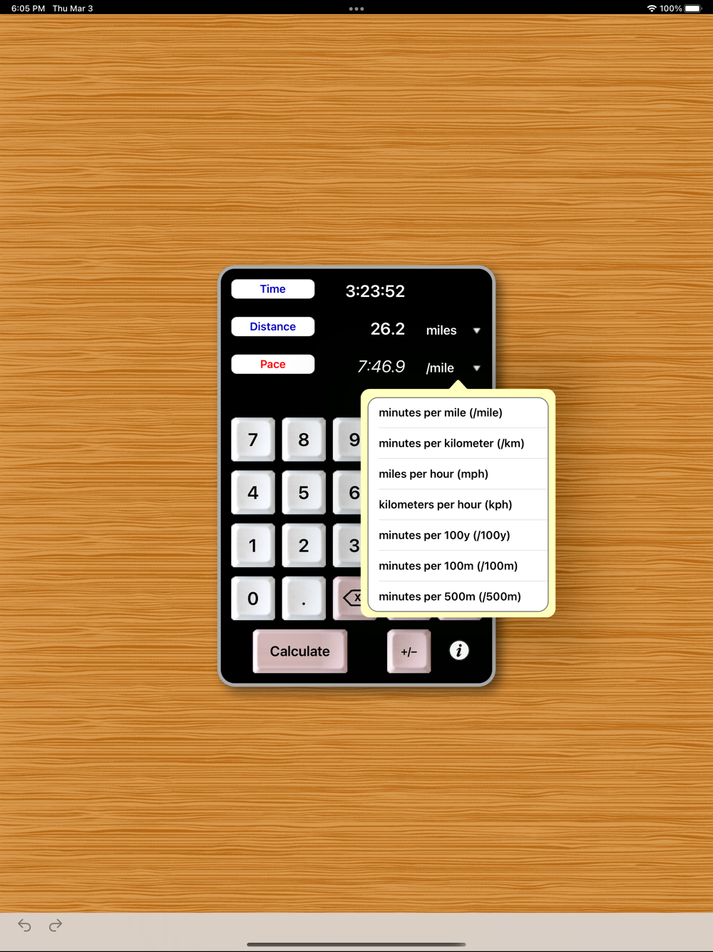 • Calculate time, distance, or pace (speed) by entering any two and calculating the third.