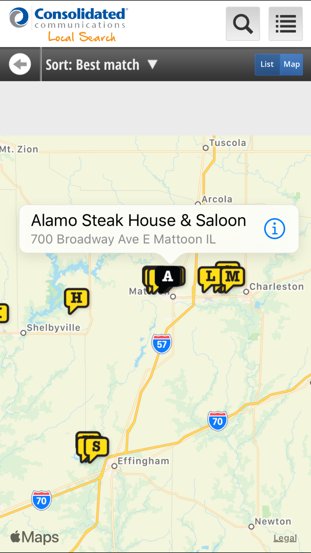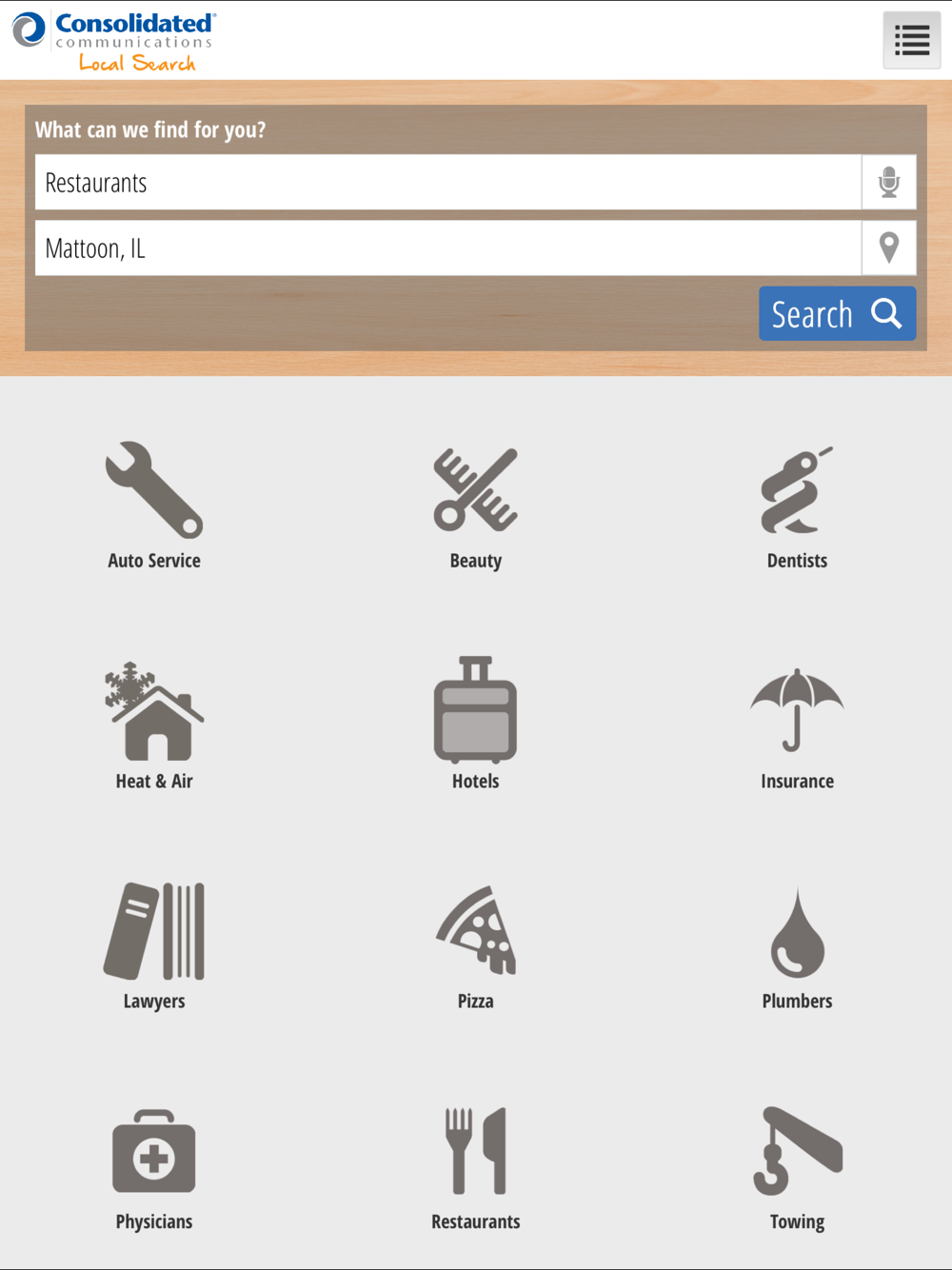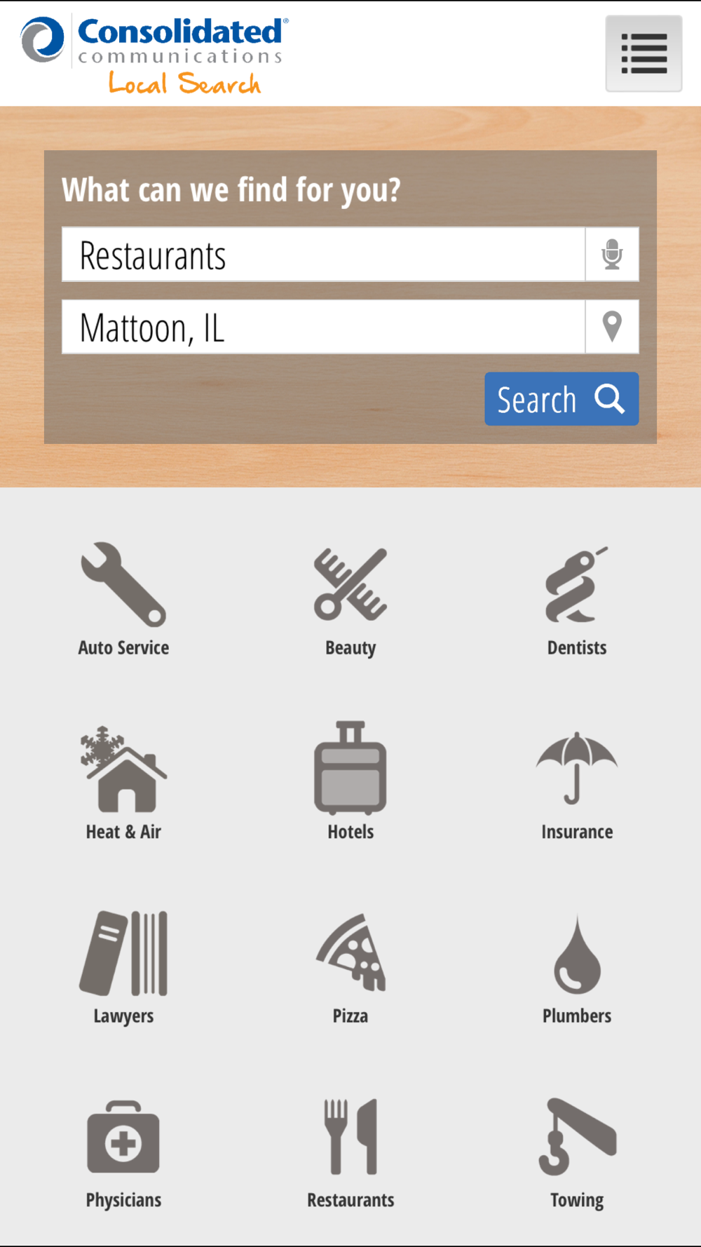 Consolidated Communications Local Search is a VOICE POWERED yellow pages search application for all Businesses and Residential locations in the United States.