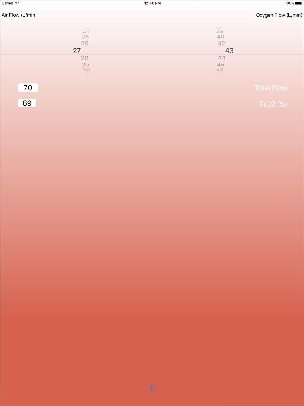 On the left column Air Flow liters/min can be chosen and on the right column are picked Oxygen Flow liters/min: Total Flow and FiO2 are the calculated using this well known formula: