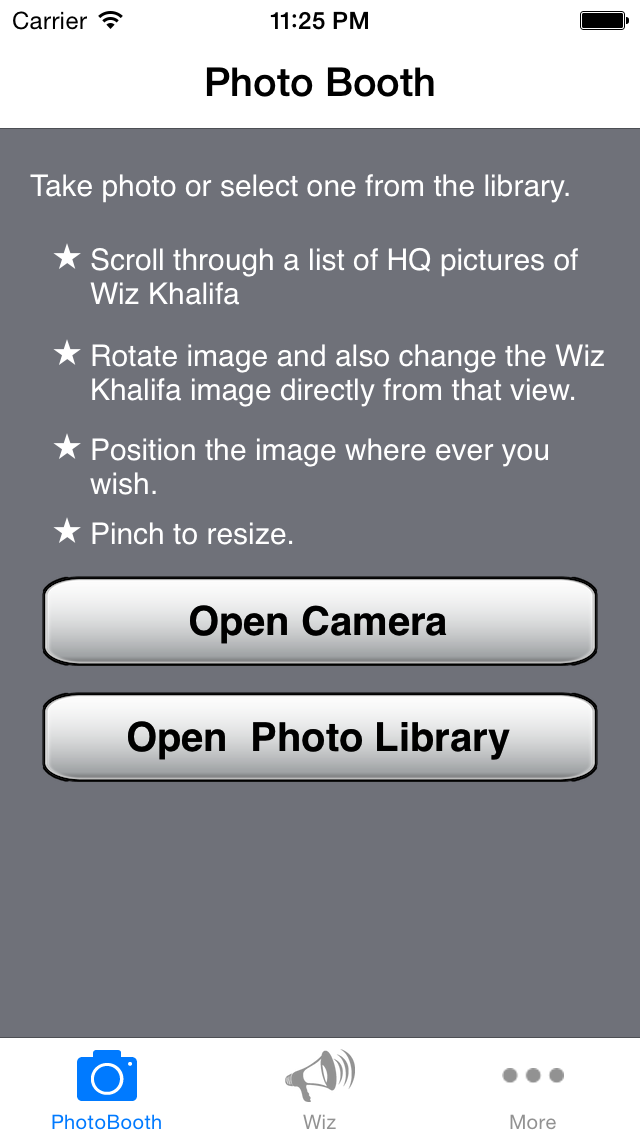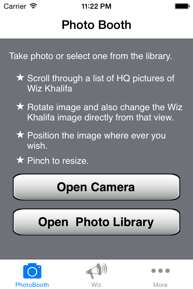 The ultimate Wiz Khalifa Application! Step inside and choose from various images of Wiz Khalifa to make them your own! Trick your family and friends with this awesome app. Now you can tell everyone you've actually met Wiz Khalifa!