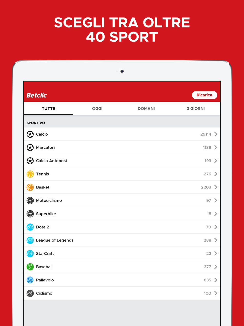 Ogni giorno avrai la possibilità di scommettere su eventi di calcio, basket, tennis e tantissimi altri sport, facendoti assaporare tutte le emozioni direttamente sui tuoi dispositivi mobili. Trovare ciò che ti interessa non è mai stato così immediato ed intuitivo grazie ad un calendario che ti mostrerà l’orario di inizio di ogni appuntamento e che ti aiuterà nell’effettuare le tue puntate.