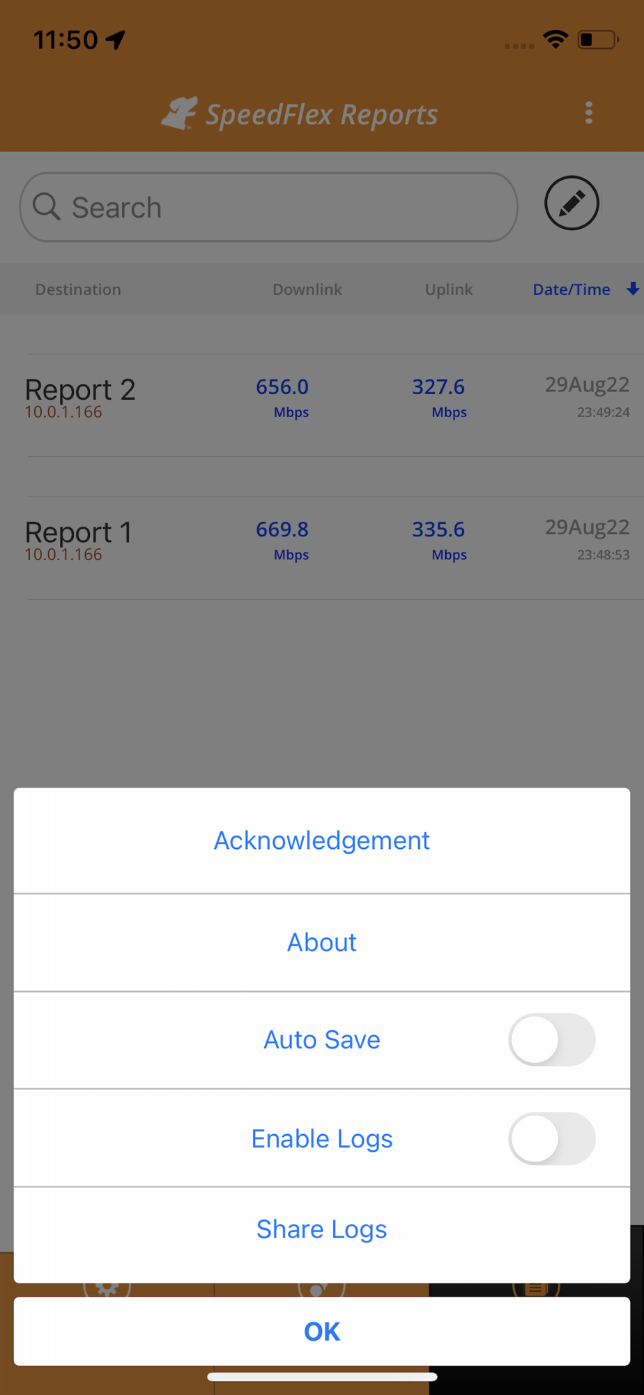 Use sharing options to share the test results to social networks like Facebook adn Twitter (provided that these apps are installed and logged in on the device)