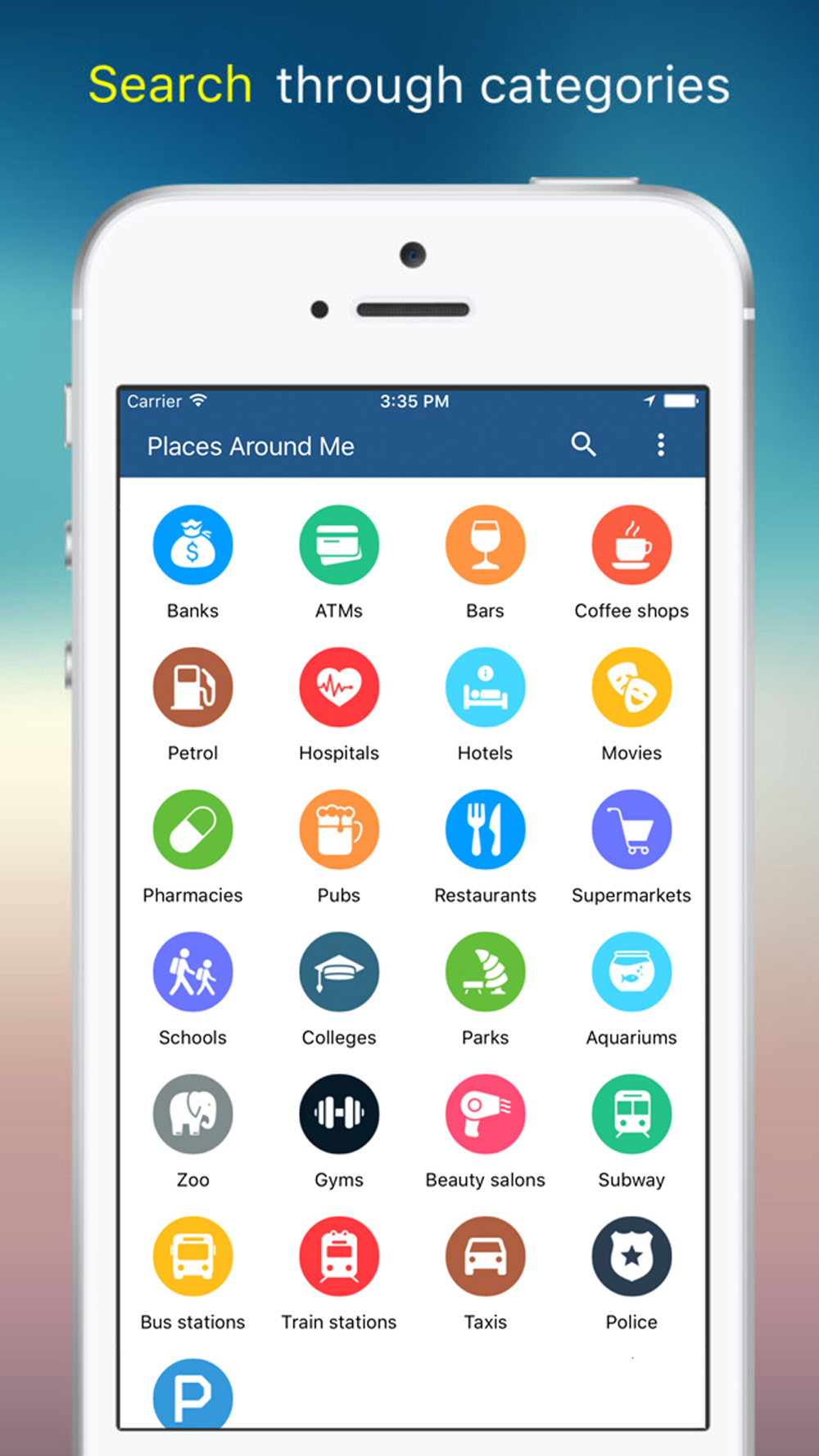 Places Around Me helps you to find any place near to your location. You may be at any location , Places Around Me will help you to find any near by ATM , Hotels , Banks , park , School , etc . The App also allows you to enter a specific search criteria like 'XYZ Restaurant'.