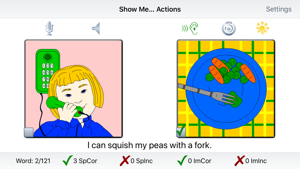 The “Show Me” prompt will ask for the main idea. A typical prompt would be “Show Me… George drank a glass of juice.” or “Show Me… Serena fell and hurt her knee.” The prompt asks the child to identify the picture that best shows the main idea of the sentence.
