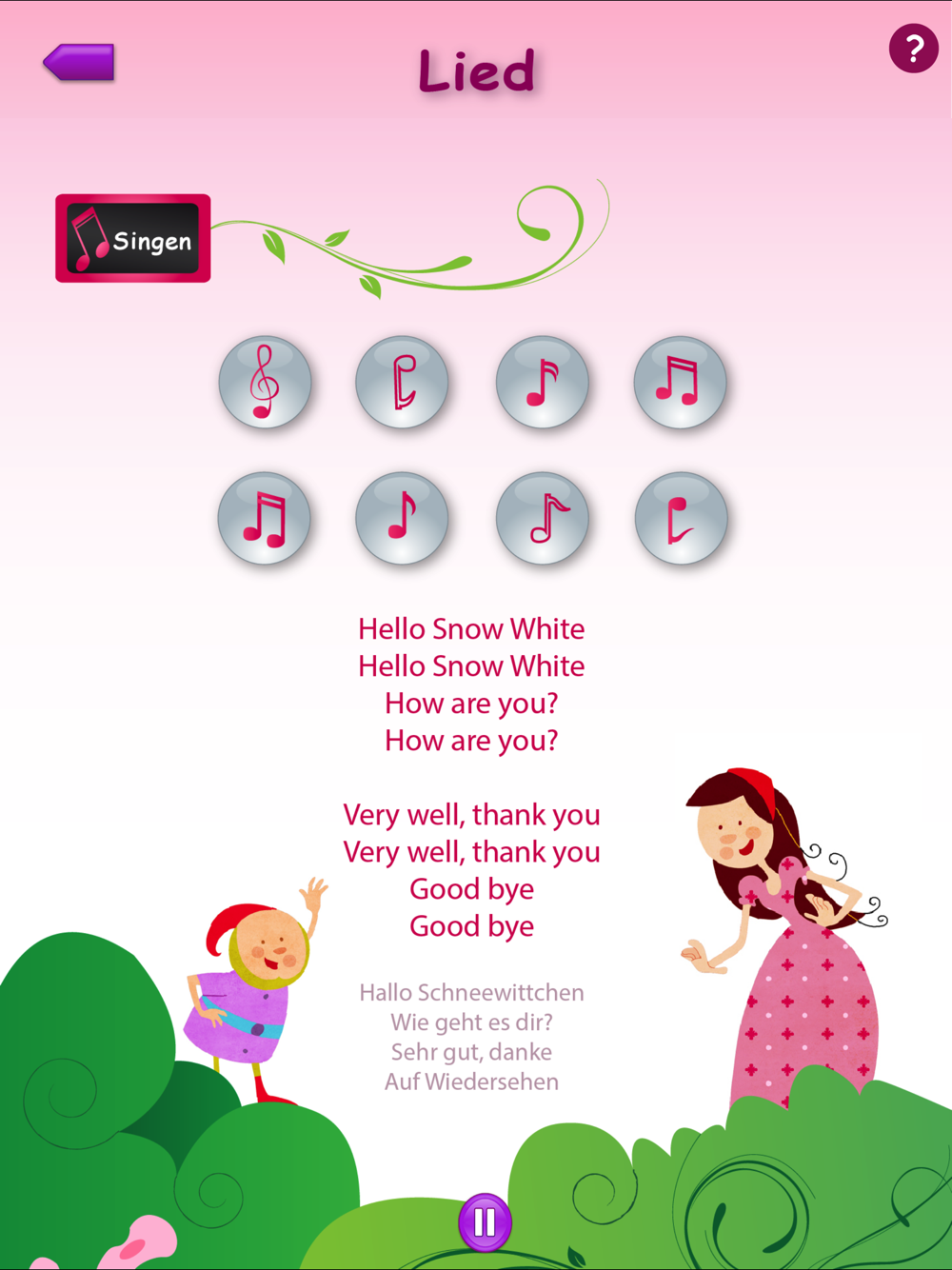 - Singen: Mit einem Lied macht das Üben Spaß. Tippe auf die Noten, um Teile des Liedes zu hören.