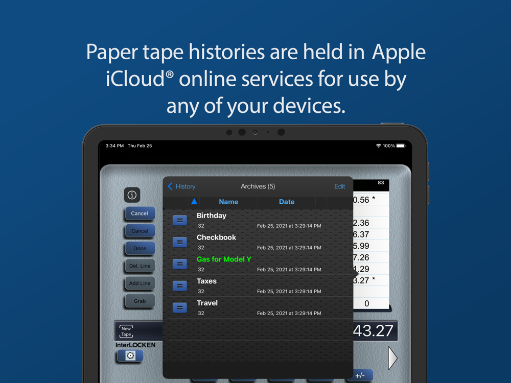 . Never lose a paper tape history again!! Keep all your devices up to date with paper tape histories held in iCloud online services.