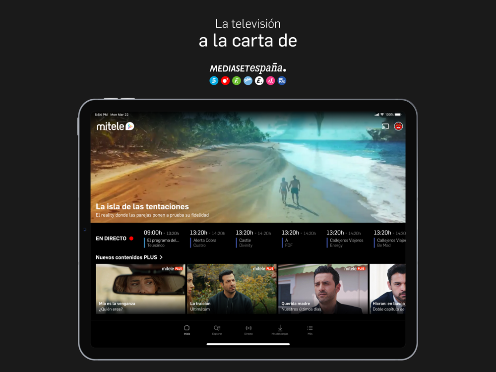 mitele es la multiplataforma digital de televisión a la carta y en directo de Mediaset España. Encontrarás los mejores contenidos de Telecinco, Cuatro, FDF, Energy, Divinity y Be Mad y podrás reproducirlos de forma legal.