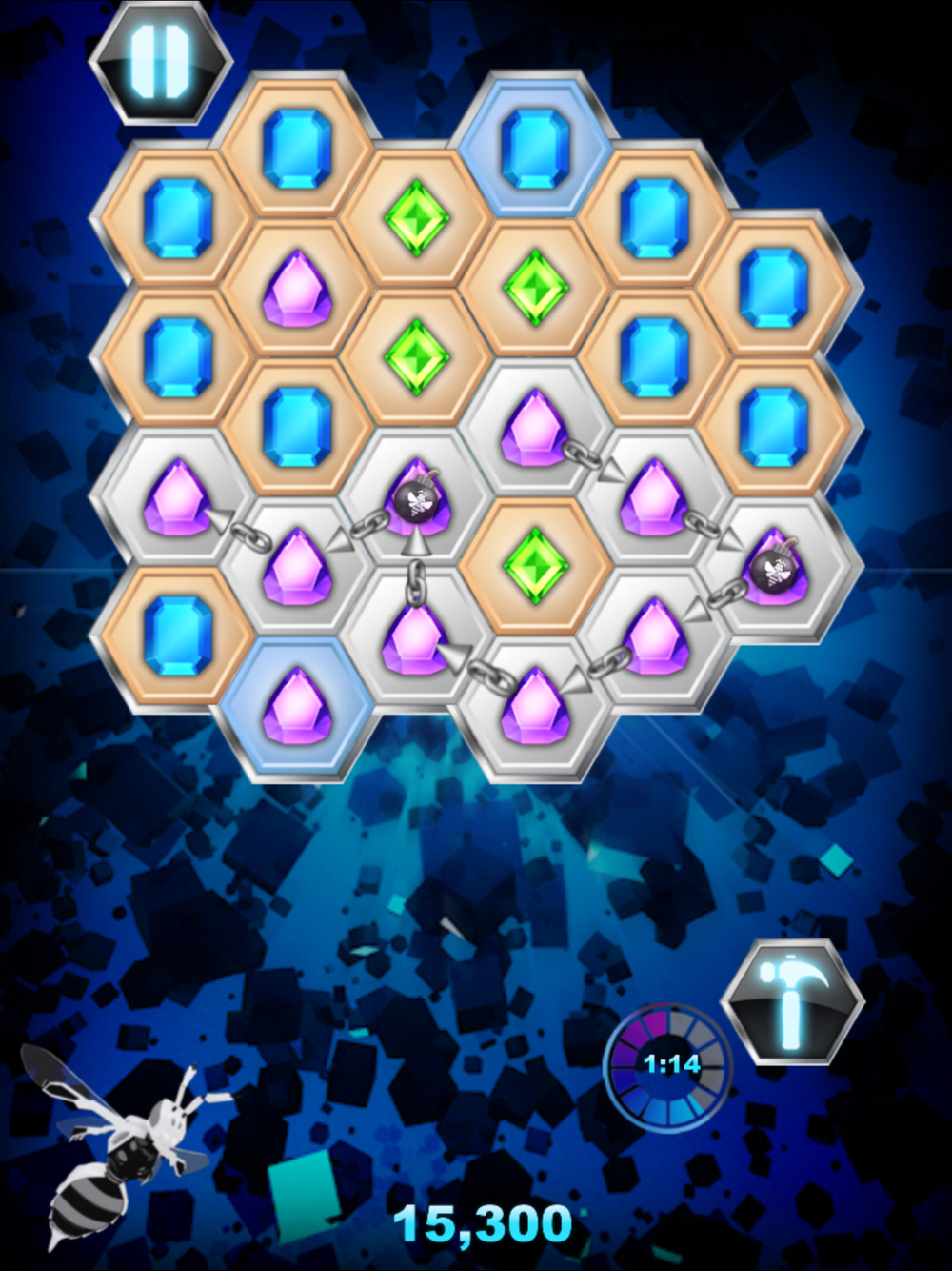 Deslice el dedo para crear cadenas de tres o más joyas hasta azulejos de fondo son destruidos y el BEE se reduce. Mantener la vinculación joyas para que el BEE caer para ganar el juego.