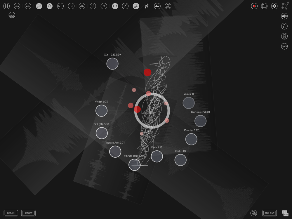 Borderlands comes ready to play with default sample content included, but you can also load and export your own sounds via Audiobus, Audioshare, and real time input from the mic or external audio interfaces. Re-sample recordings made within the app on-the-fly for layers-upon-layers of granulation.