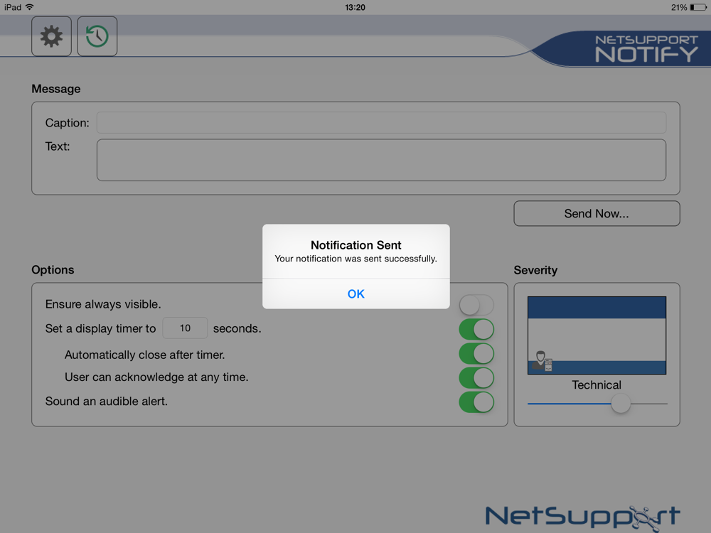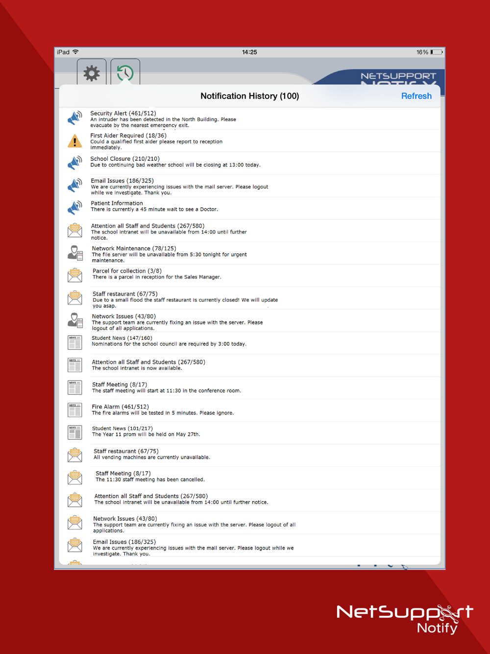The Mobile Console, a free of charge extension to the traditional NetSupport Notify desktop version, enables you to deliver instant and attention grabbing alerts and notifications direct to Windows, Mac and Linux desktops or unattended information displays across your organization from your tablet or smartphone.