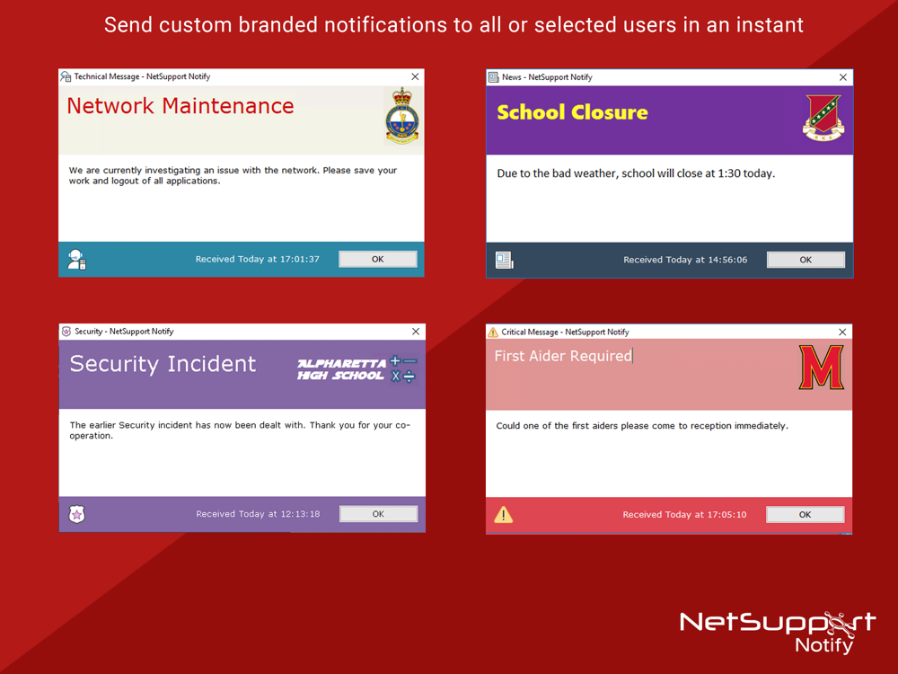 A focused solution for on-demand desktop alerts, emergency notifications, popup alerting and one-way messaging needs, NetSupport Notify cuts through the distractions to deliver your message direct to connected desktops, ensuring it can't be skipped, ignored, saved for later or get lost in a busy inbox!