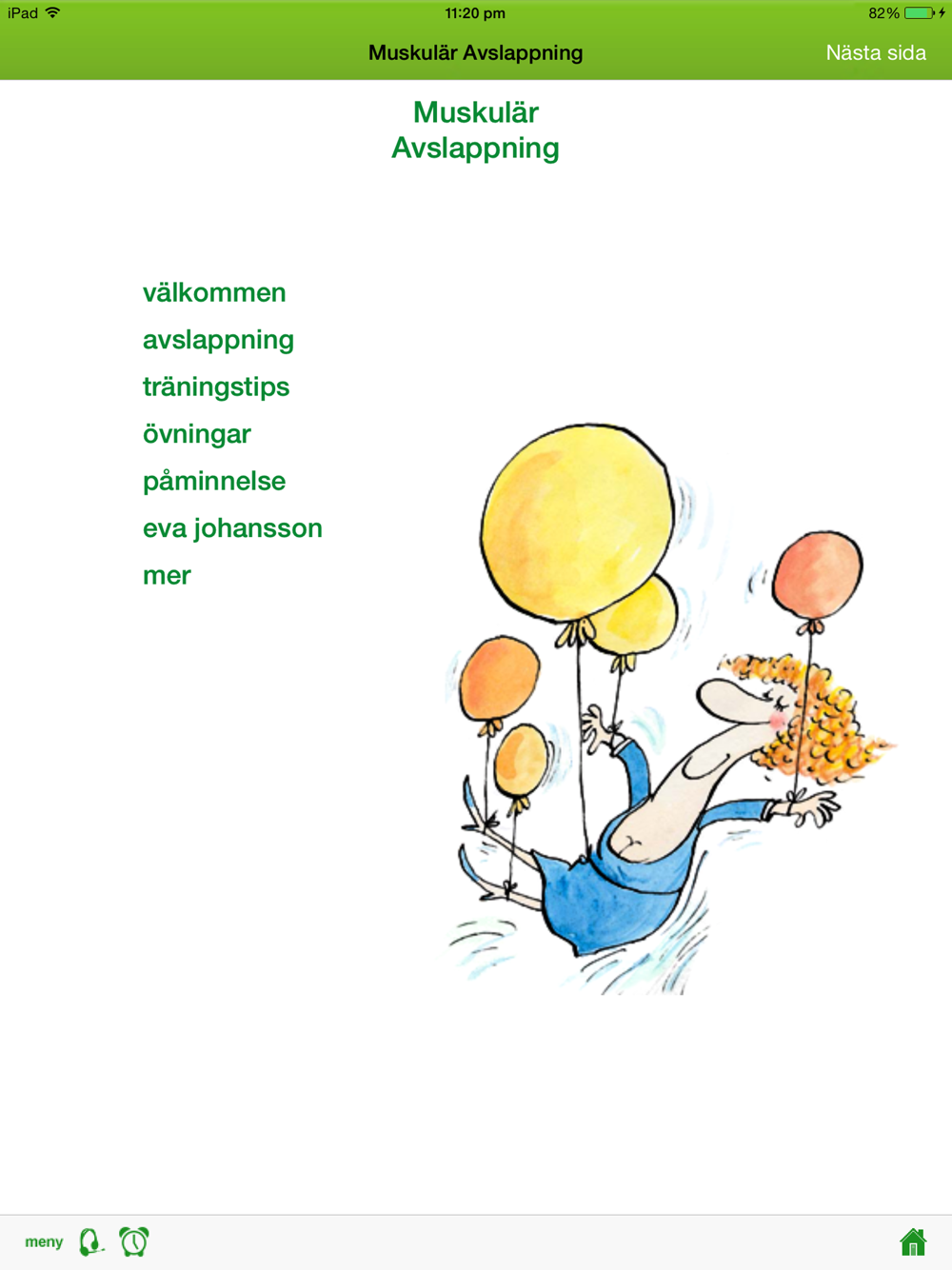 Muskulär avslappning ingår i en serie appar gjorda och inspelade av Eva Johansson som brukar få feedback på att ha en av Sveriges skönaste avslappningsröster.