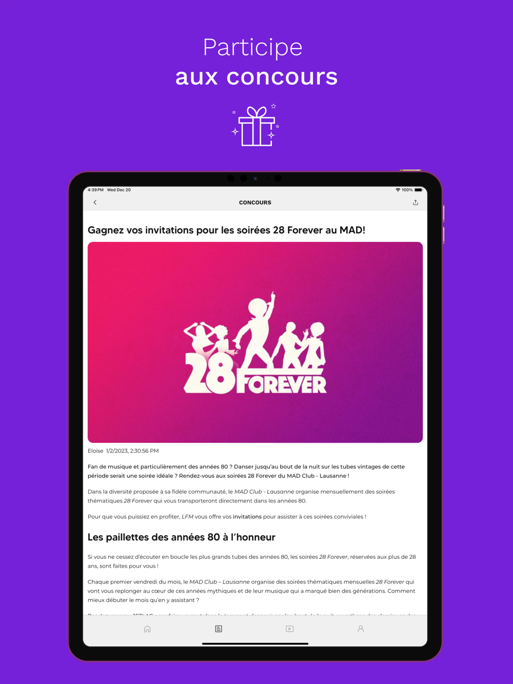 Emportez dès maintenant avec vous LFM, la première radio privée de Suisse romande.