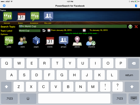 All created "Topics" are represented with icons at the top of the display. To access a Topic, click the topic's icon or swipe left or right for desired topic. On start-up all Topics are "run" to reflect current information on Facebook. You can also query a desired date range, if you like.