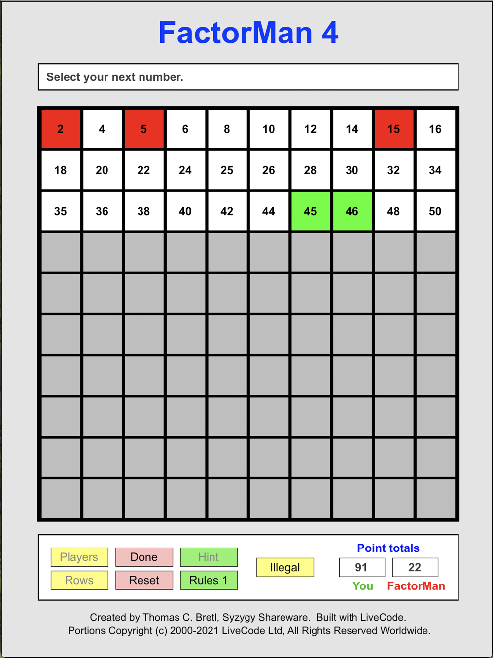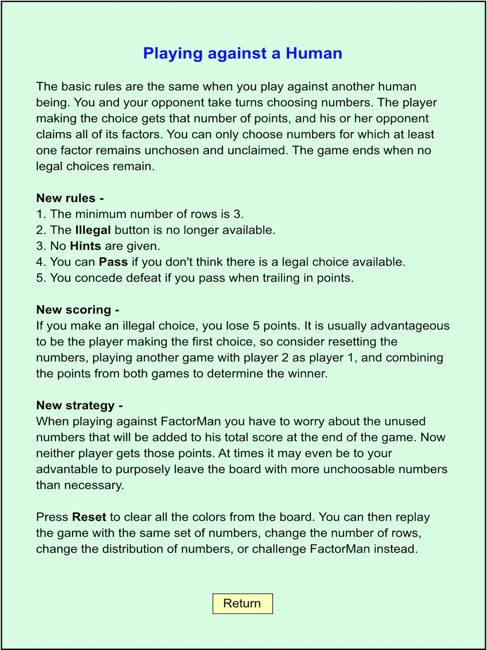 This math game is played against the superhero FactorMan! You earn points by choosing numbers between 1 and 100. If you choose 5, you get 5 points; if you choose 18, you get 18 points. But FactorMan gets the sum of all of the factors of the number you have chosen (except for the number itself). If you choose 12, for example, you get 12 points, but FactorMan gets 1+2+3+4+6=16 points! Once a number has been used to gain points (by either you or FactorMan), it cannot be used again, and you may choose only numbers that have at least one other factor left on the board. To win you must have good arithmetic skills and develop a careful strategy. It is not as easy as it might sound! You can also play the game with a human opponent instead of FactorMan. This significantly changes the strategy needed to win.