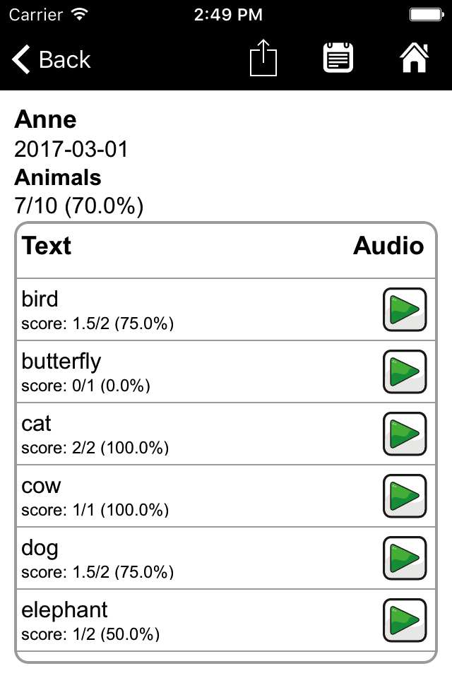 Each card shows customizable text and a picture. Tap on the text or picture to hear an audio recording. Use the microphone to practice speaking and then listen to get immediate feedback. Create and share cards with your friends and colleagues.
