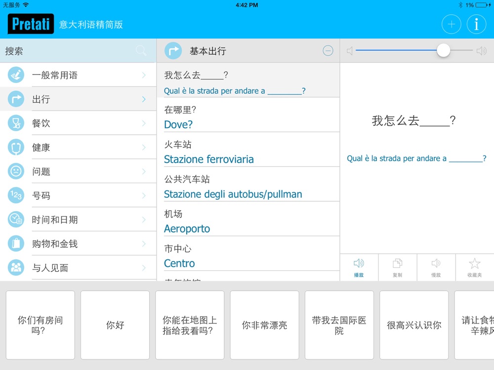 Italian Pretati Lite 应用专为外国旅客以及希望学习意大利语的人士设计。该应用拥有分为10个类别的500多个常用词汇,这些类别包括基本资料、出行、餐饮、健康、问题、数字、时间和日期、购物和货币、与人会面以及有用词汇。