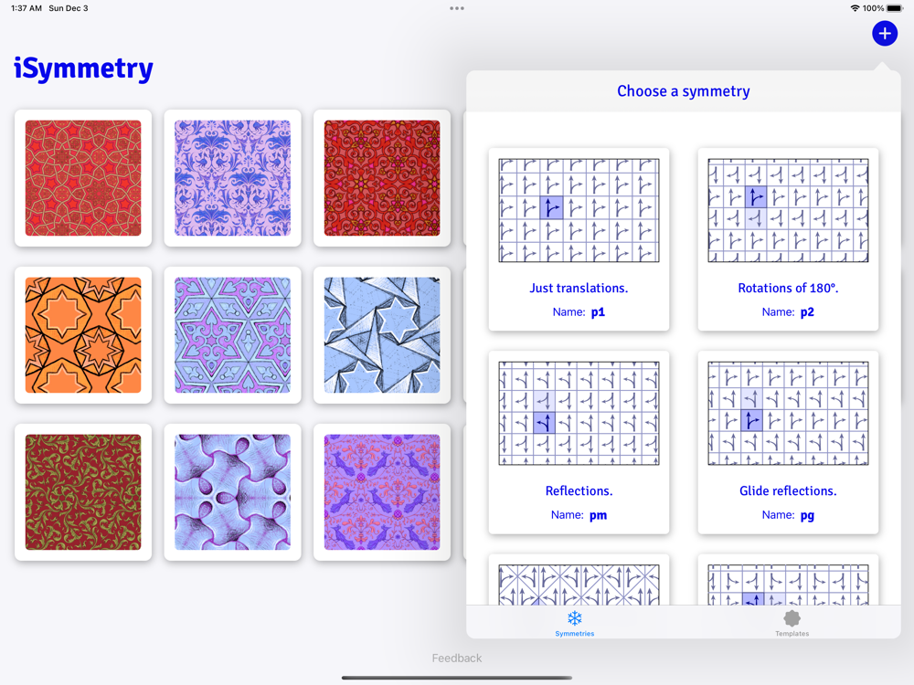 iSymmetry is a unique painting app for pattern design. Choose from 17 different symmetries (Wallpaper Groups) and watch as every brushstroke is transformed into mesmerising patterns. Discover an infinite kaleidoscope of creativity. iSymmetry is fun and intuitive and packed with powerful features: