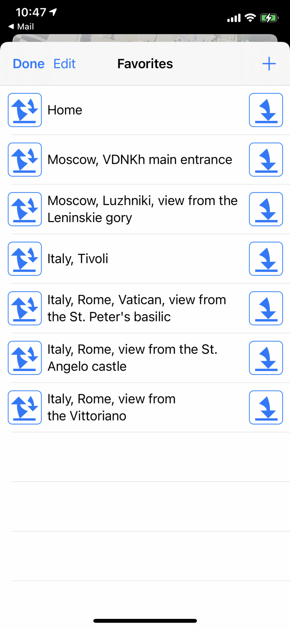 List of Favorite places allows you to remember geographical coordinates and shooting options. List of Favorite places stored in iCloud and quickly synchronizes through all of your devices so it will be identical on all of them.