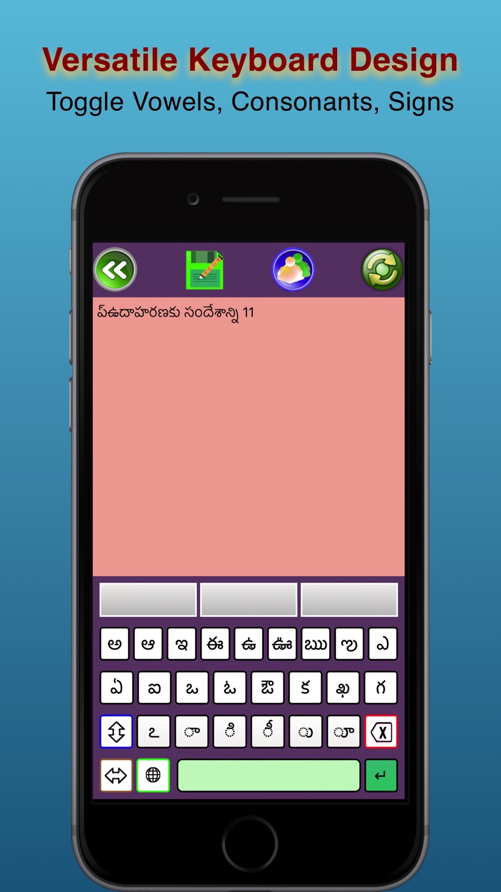 Telugu editor with keywords, templates, and unique keyboard design to easily edit and create text messages and share with friends on social media. Includes two additional languages Hindi and English for seamless selection and edit.