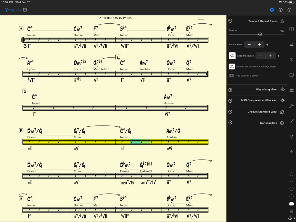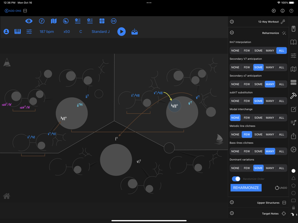 Play-along, Practice Improvisation. Reharmonize any song with the tap of a button. Create 12-keys workouts to practice. Study Target Notes and Upper Structures.