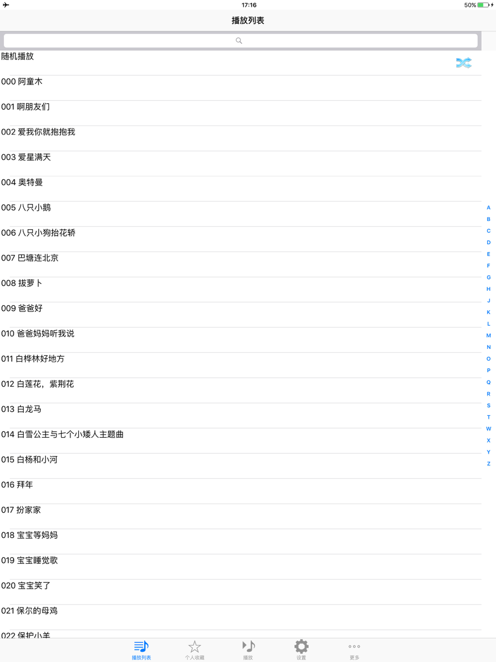 歌曲列表可按汉语拼音首字母索引,方便歌曲的快速查找