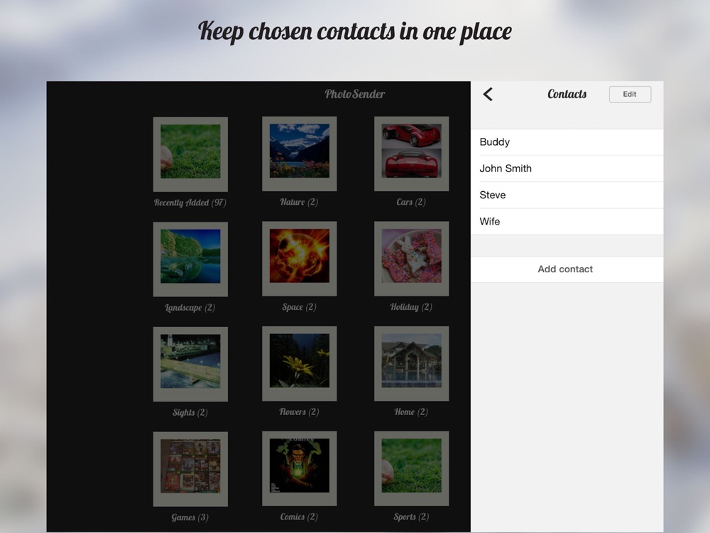 PhotoSender makes sharing photos easier than ever. Select photos from the album, choose photo service you like and email photos link to your buddies. Or send photo directly to nearby buddy using WiFi or Bluetooth.