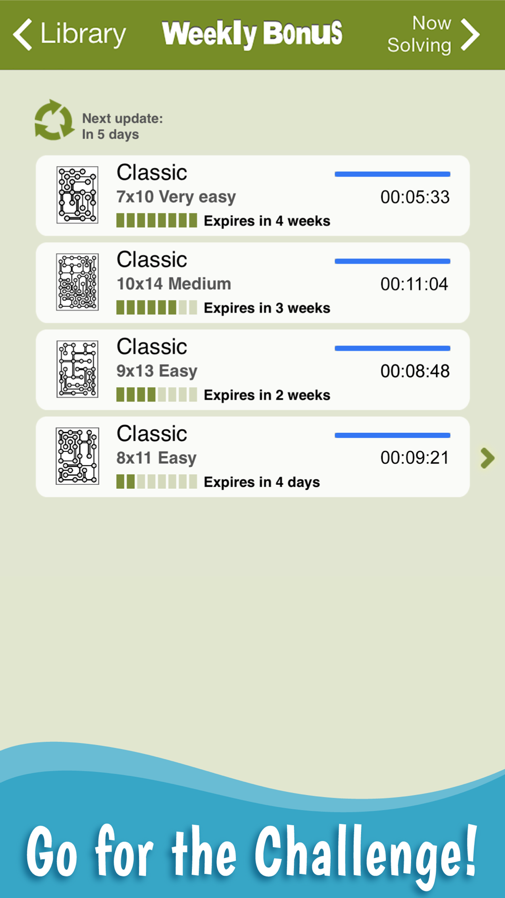 For more fun, Hashi includes a Weekly Bonus section providing an extra free puzzle each week.