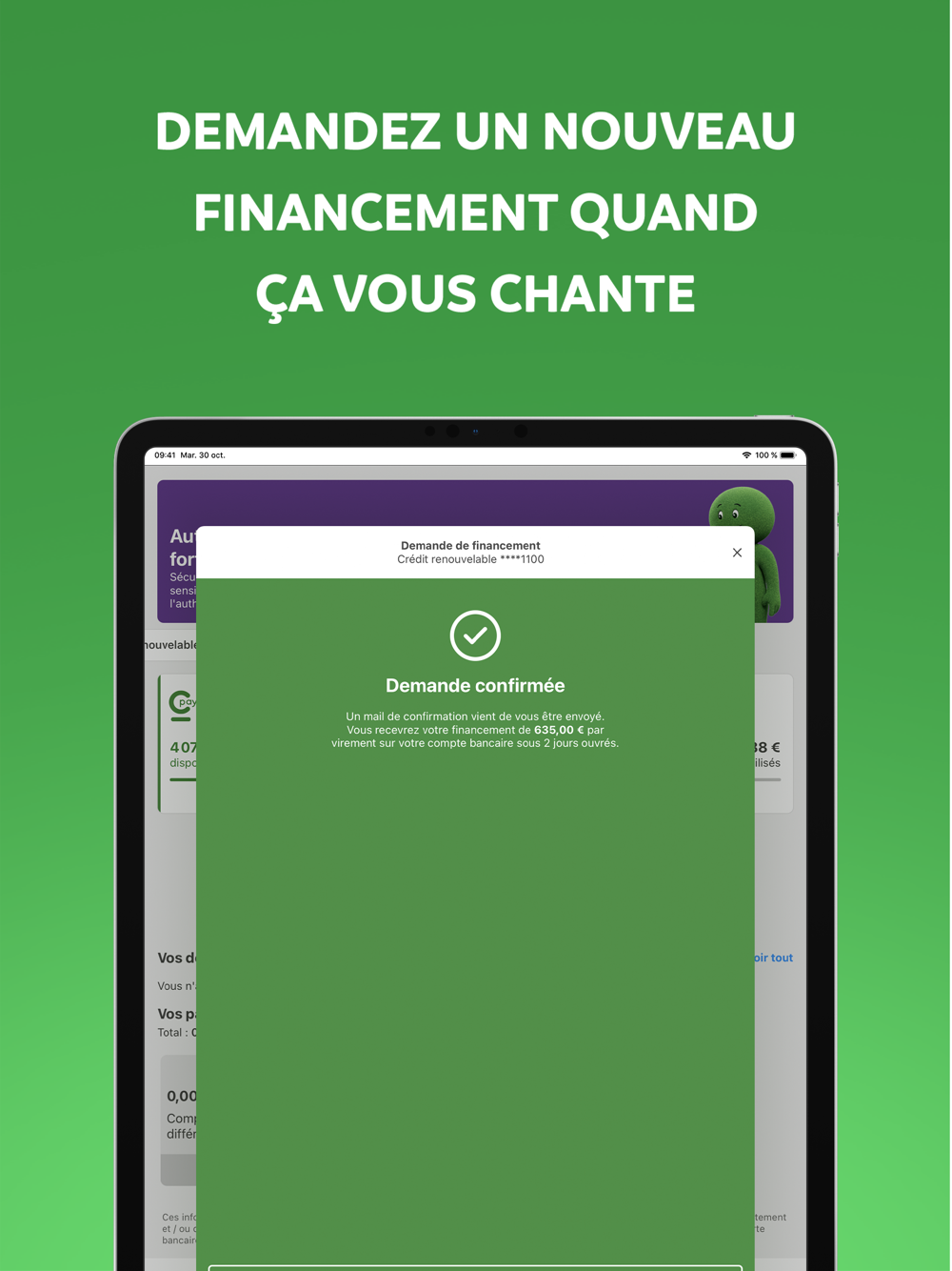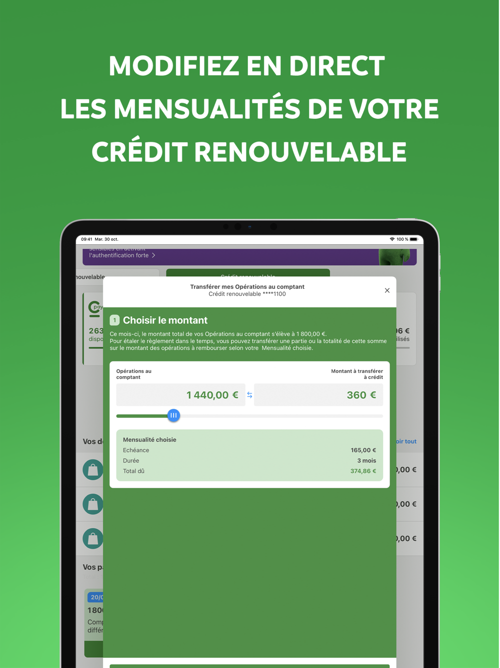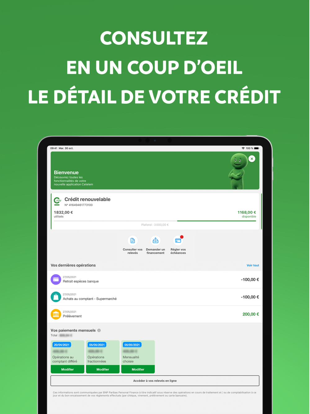 - Consultez le solde de votre crédit renouvelable et visualisez facilement le montant de votre crédit disponible, le montant déjà utilisé, ainsi que le plafond de ce dernier.