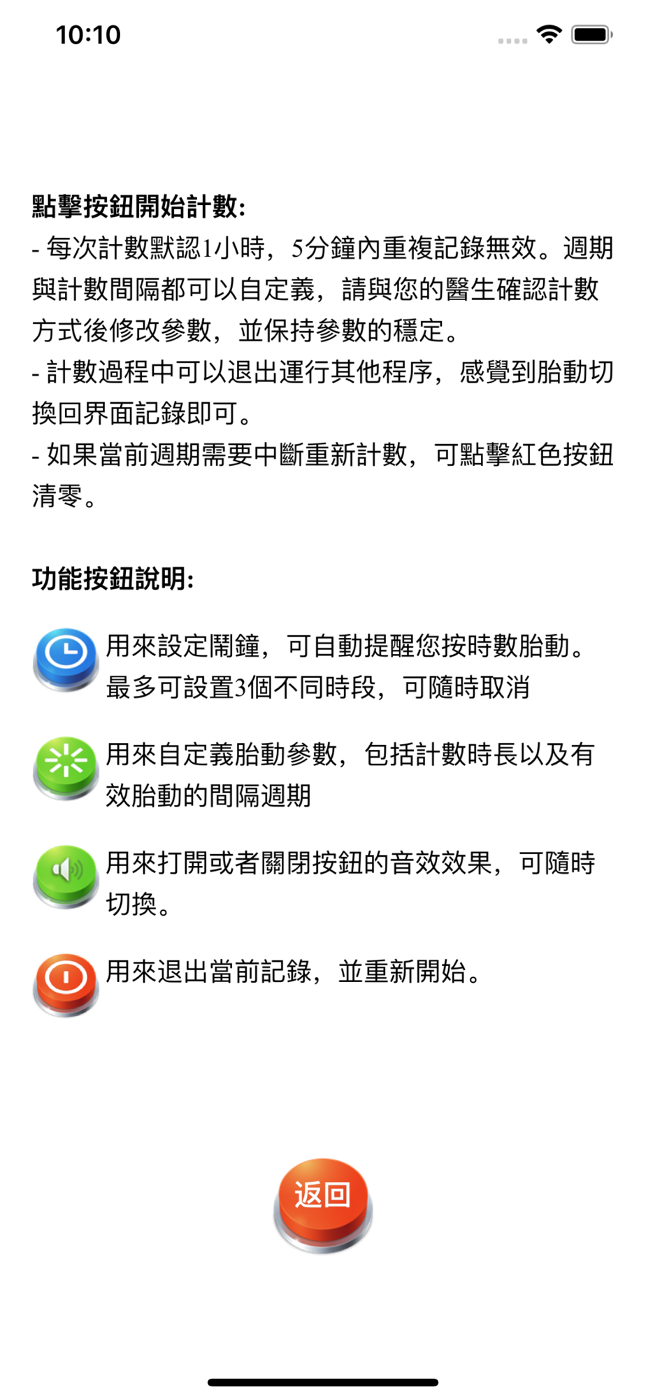 * 智能判断有效胎动, 五分钟内重复计数将不予记录,并有实时声音提醒(可在需要的情况下随时关闭)