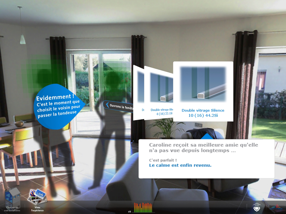 Different noisy situations commonly encountered were identified and for each of these situations, the application restores the sound insulation provided by various compositions of insulating glazings.