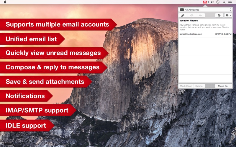 Mail Call is a full feature mail notifier for email accounts that support IMAP. Be notified when unread messages come in, and be able to quickly react to them by viewing, replying, moving, deleting, and more!