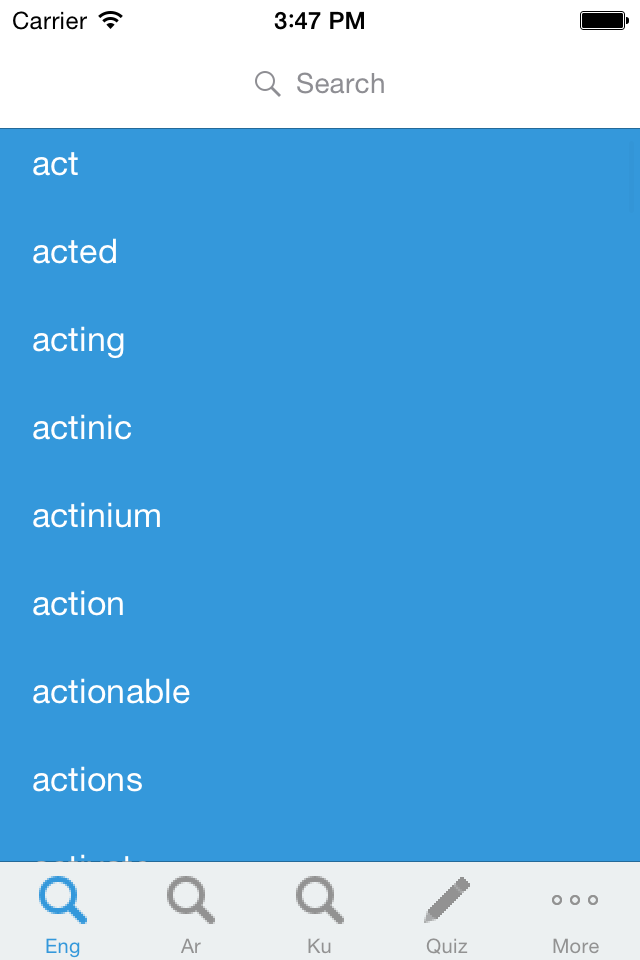 You can manually search for words and find their Kurdish meanings. You can even create your own list of favourite words to stay in your Favourites tab. History tab will show you the last 20 words you have visited.