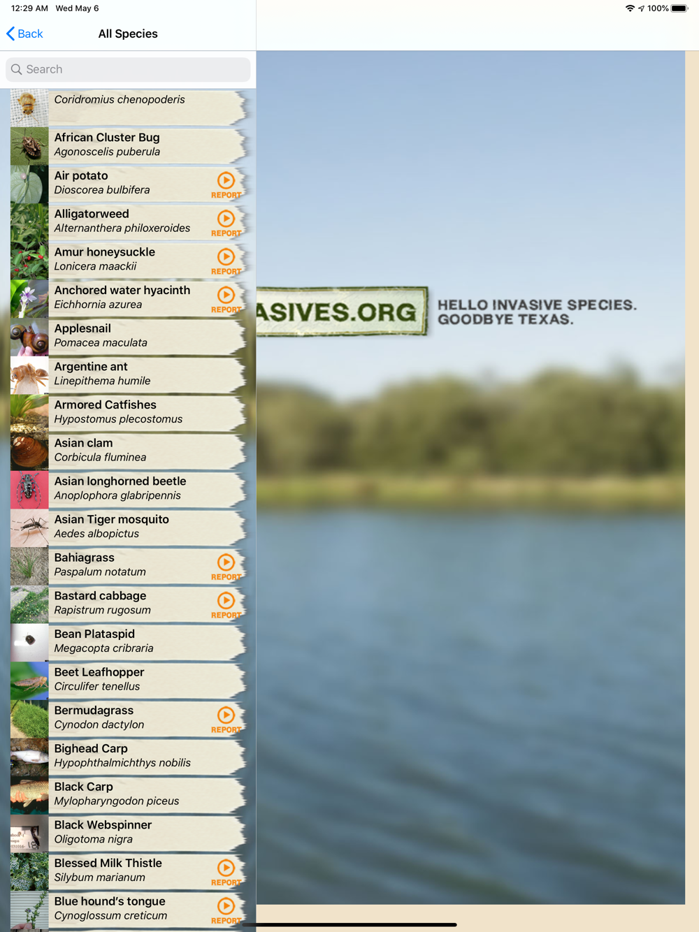 The Invaders of Texas Citizen Science program collects species observations from volunteer "citizen scientists" trained to use a specially developed Invasive Species Early Detection and Reporting Kit. With this kit, volunteers detect invaders' arrival and dispersal in their own local areas. The purpose of this database is to provide geographical locations and distributional information for known and "potentially" invasive plant species.