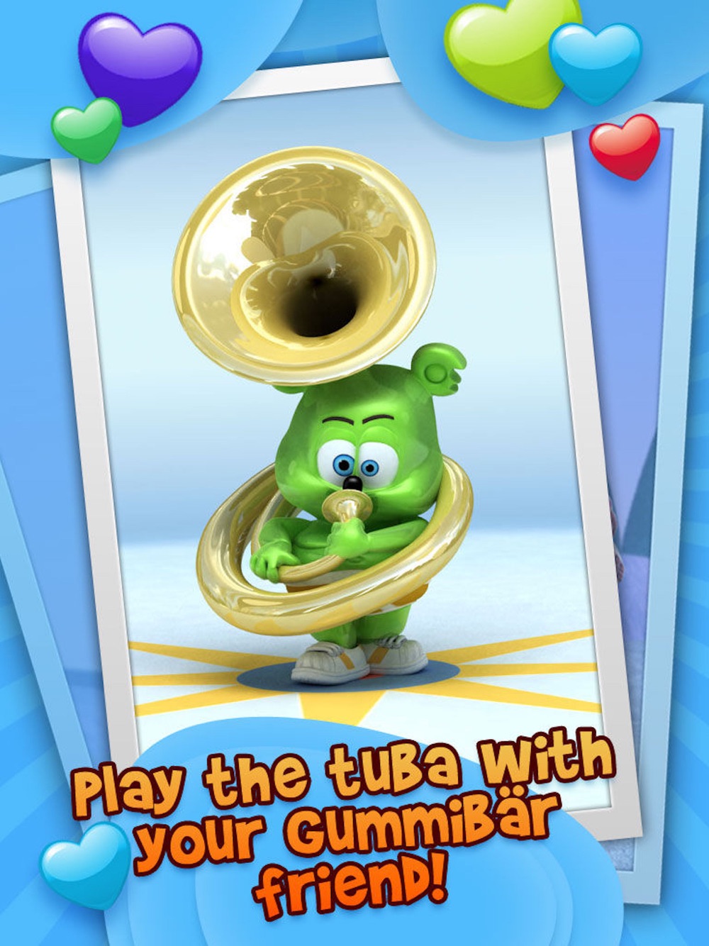 Use your finger to touch the screen and see Gummibär’s fun reactions and animations, learn how to play the tuba with your new little friend, listen and dance to Gummibär’s most famous songs, have a ton of fun playing the supergame, and enjoy personalizing and sending funny e-cards to all your friends!