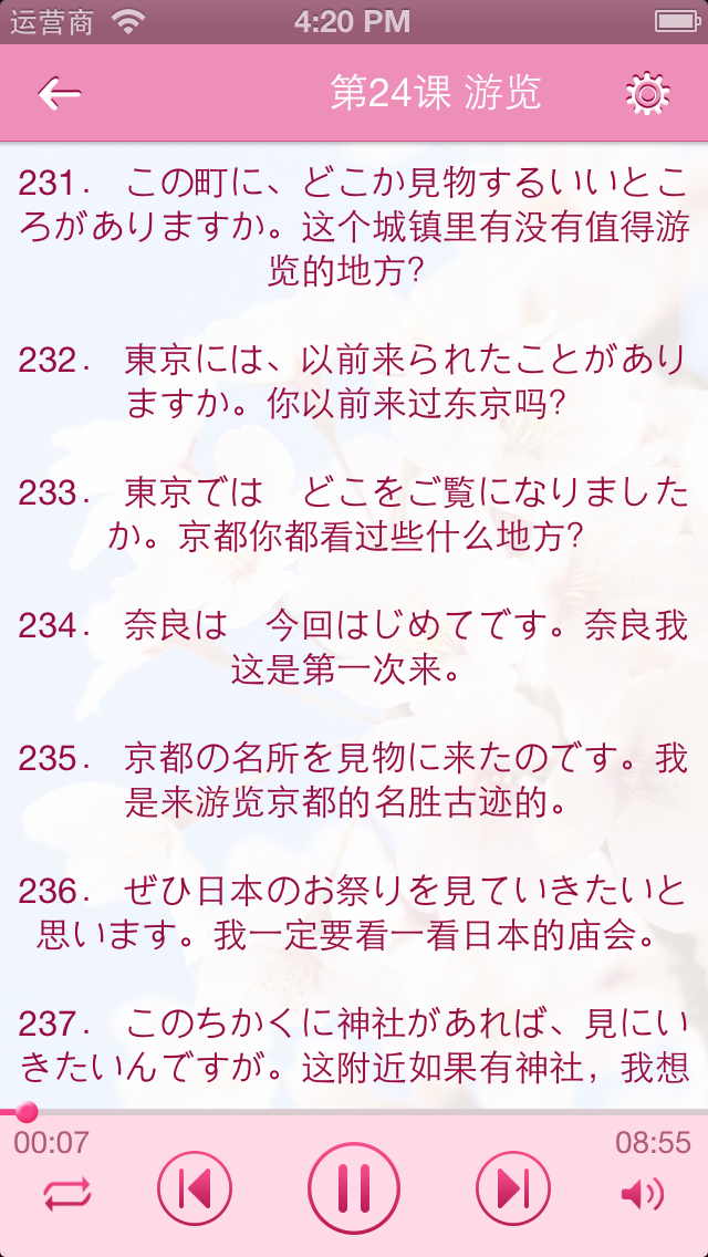 《日语300句》为日常生活中常用句式,全集共分30课,外加一节复习课,音频和文本播放,声音清晰,文本简洁。目录如下:
