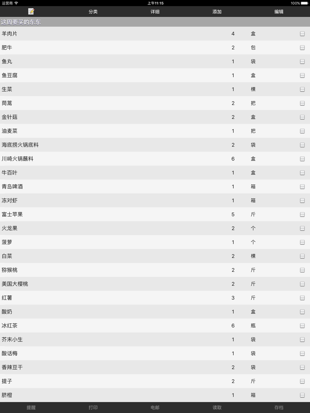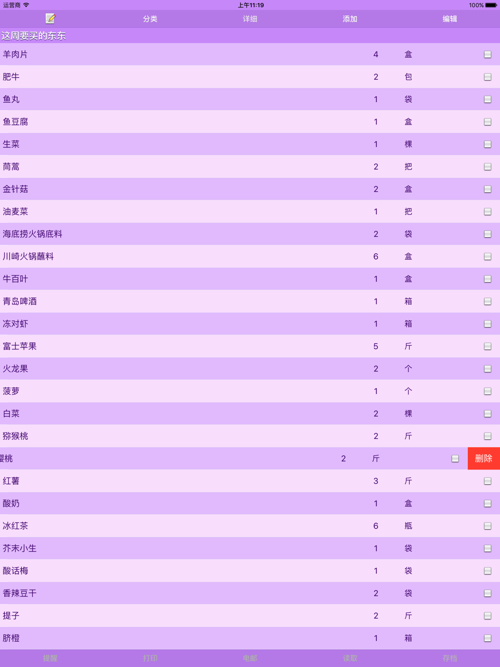 4.分类功能可以依据采购物品的品牌,商店和是否已经购买对采购物品分类。