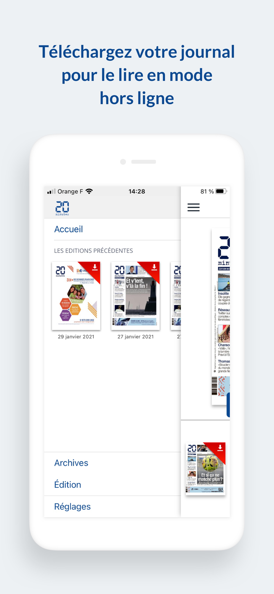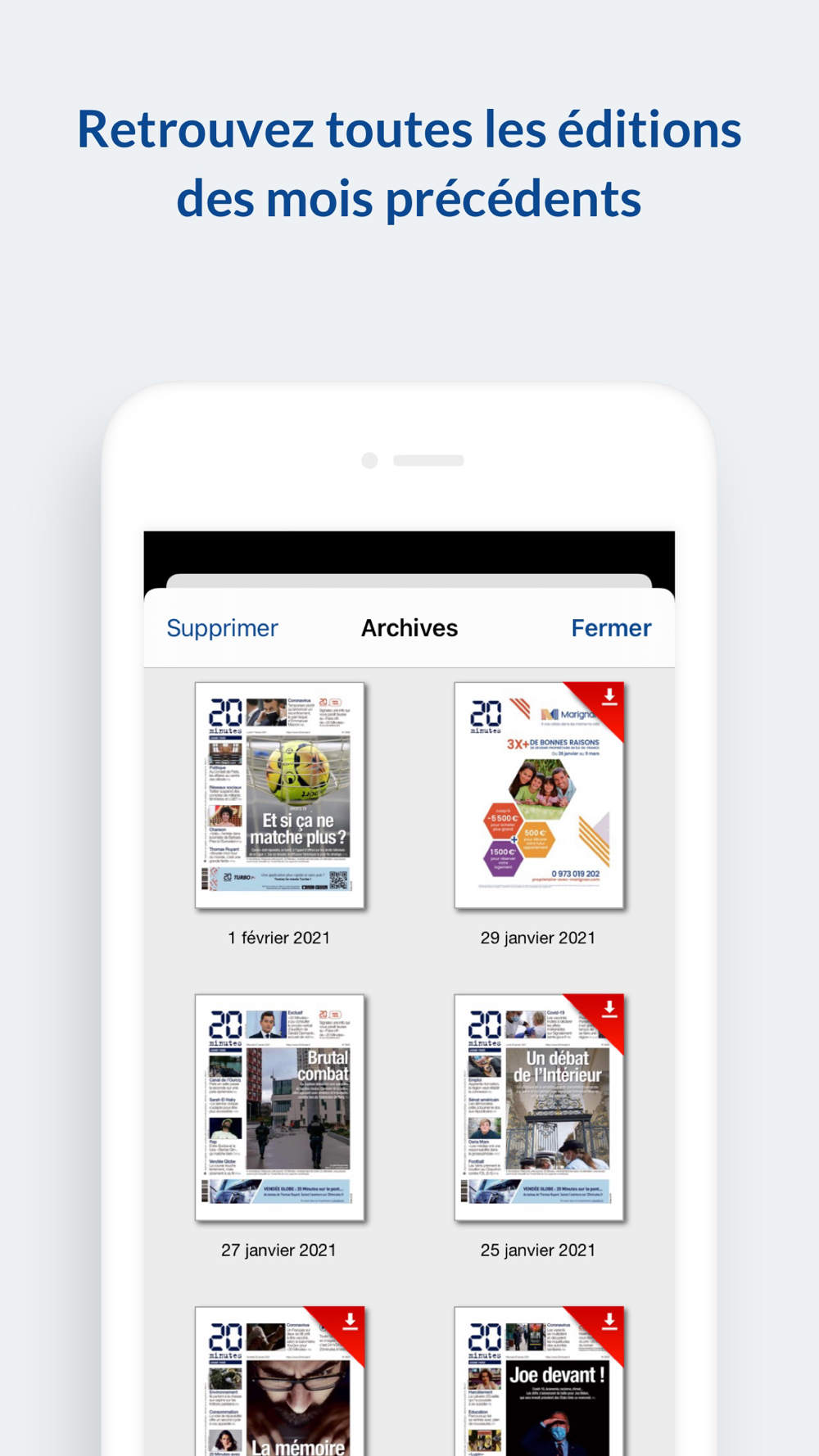 L’application 20 Minutes - Le journal permet de télécharger jusqu’à 30 jours d’archives pour retrouver les anciennes publications du mois ou du mois dernier. Pour plus d’archives, rendez-vous sur notre site 20 Minutes.