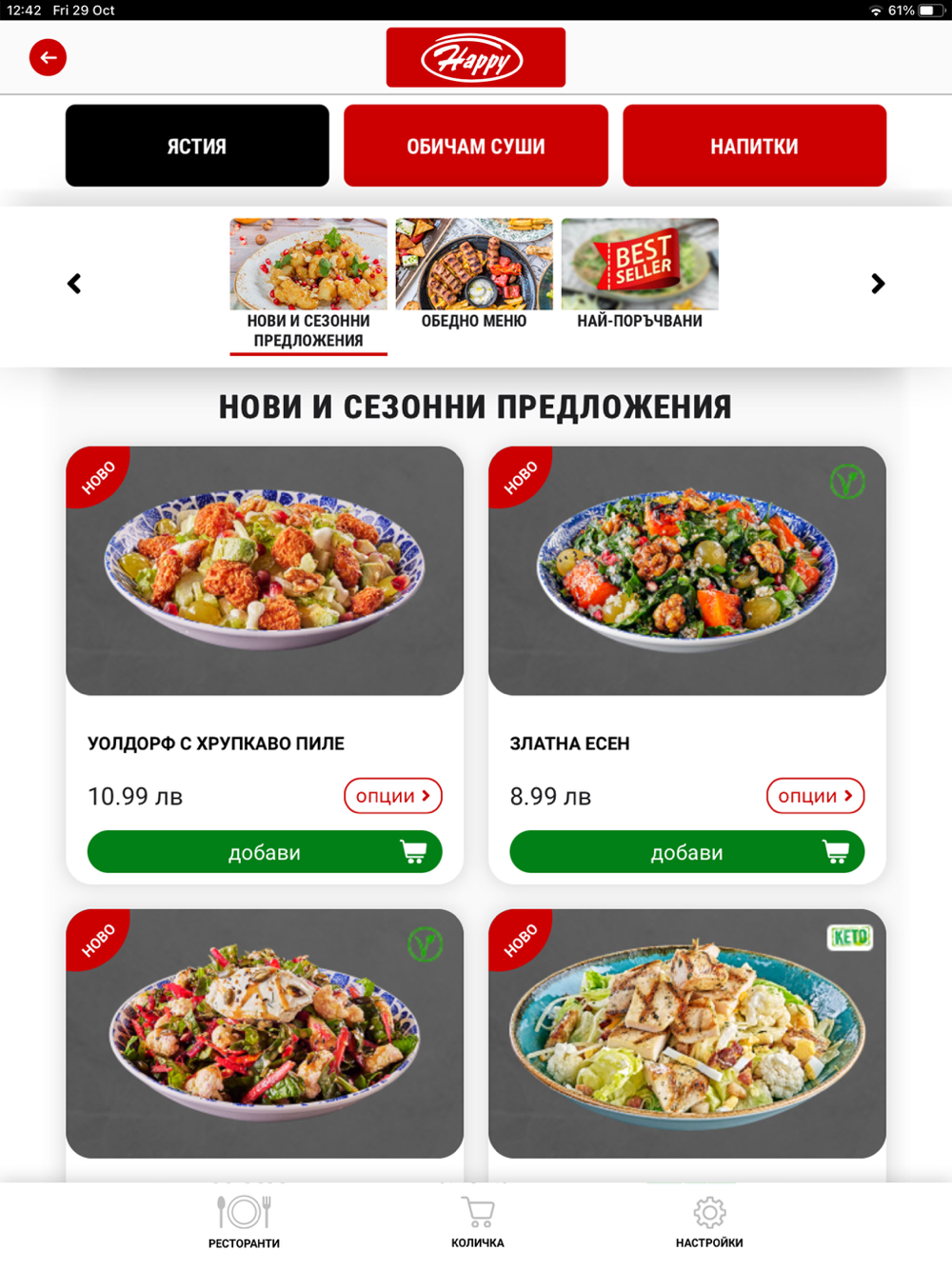Чрез мобилното приложение на Happy Вие можете лесно поръчате ястия от нашите заведения във Варна, София, Бургас, Пловдив или Русе.