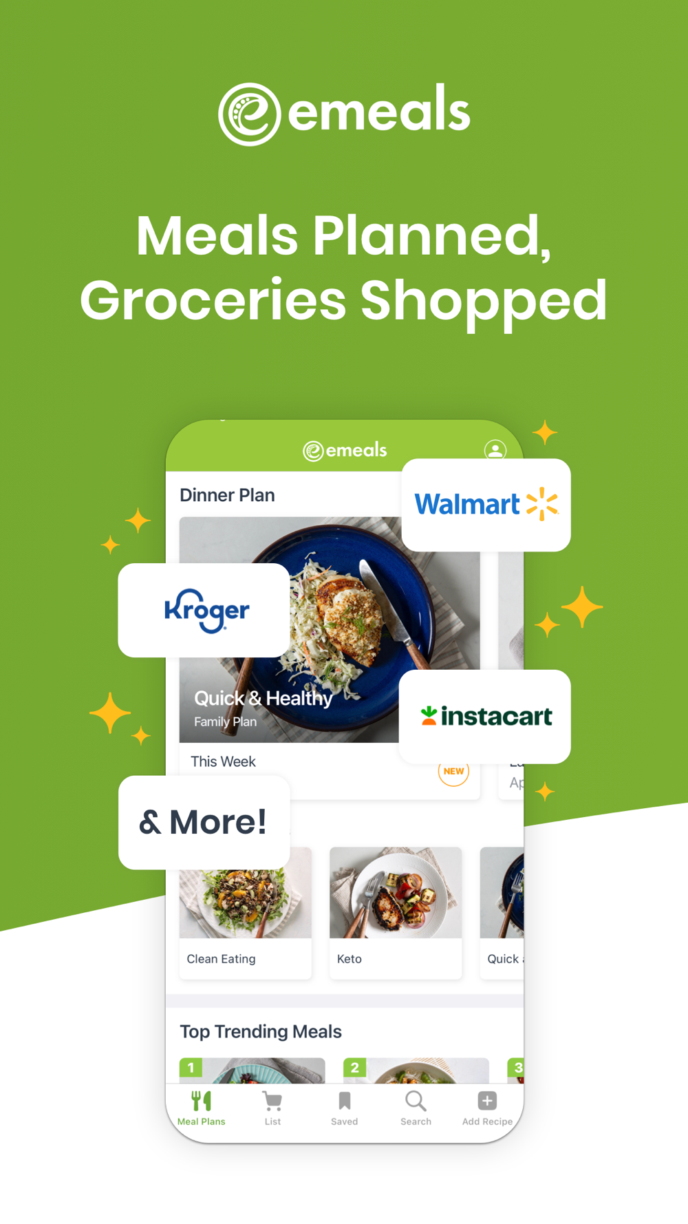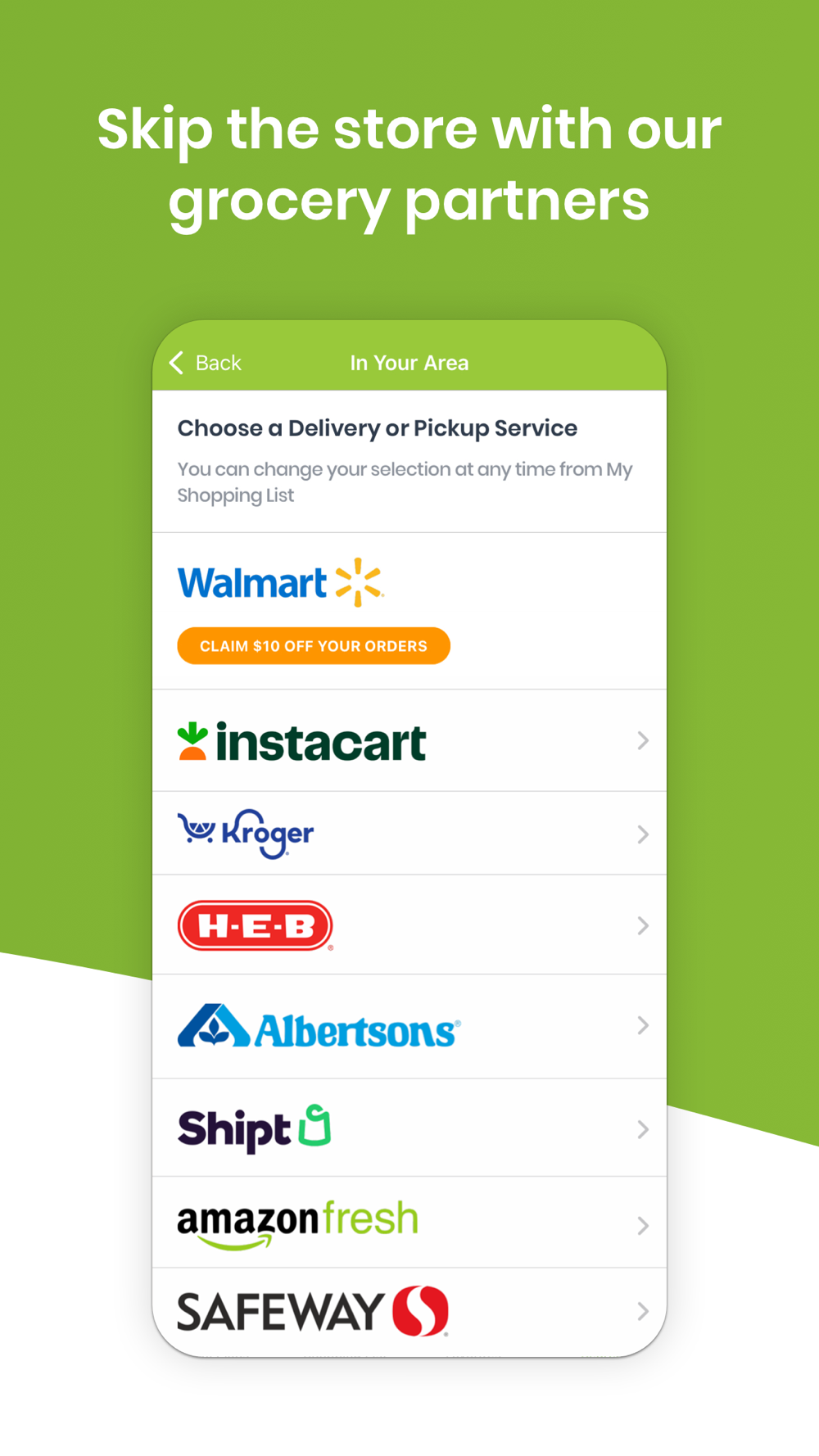 Each meal plan’s automated grocery list connect directly to grocery partners like Walmart, Instacart, Shipt, AmazonFresh, Albertsons, Safeway, H-E-B or Kroger without leaving the app. You can have your grocery & shopping list gathered for curbside grocery pickup or home delivery.