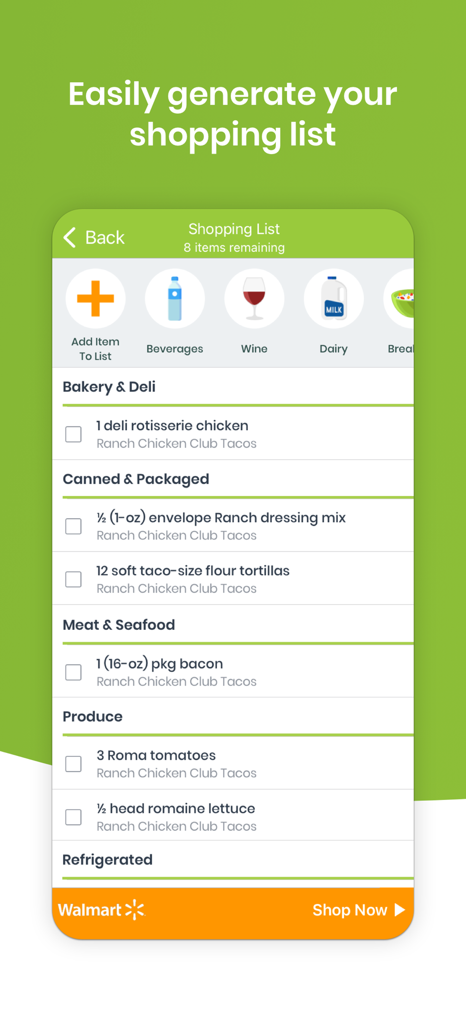 Not interested in online grocery options? Our customizable shopping list breaks down ingredients by location in the grocery store to make shopping in person a breeze.