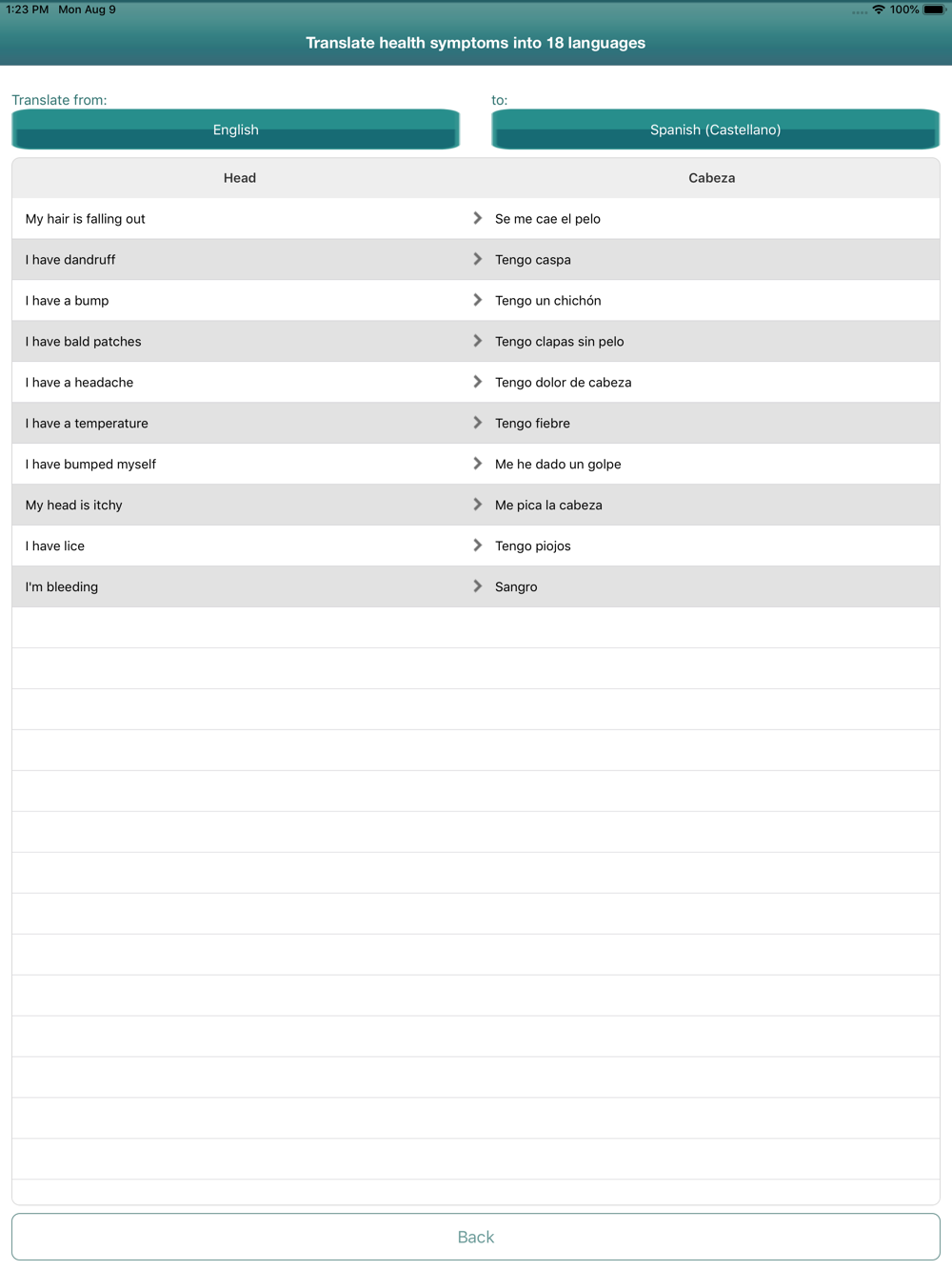 Health symptoms translator in 18 languages