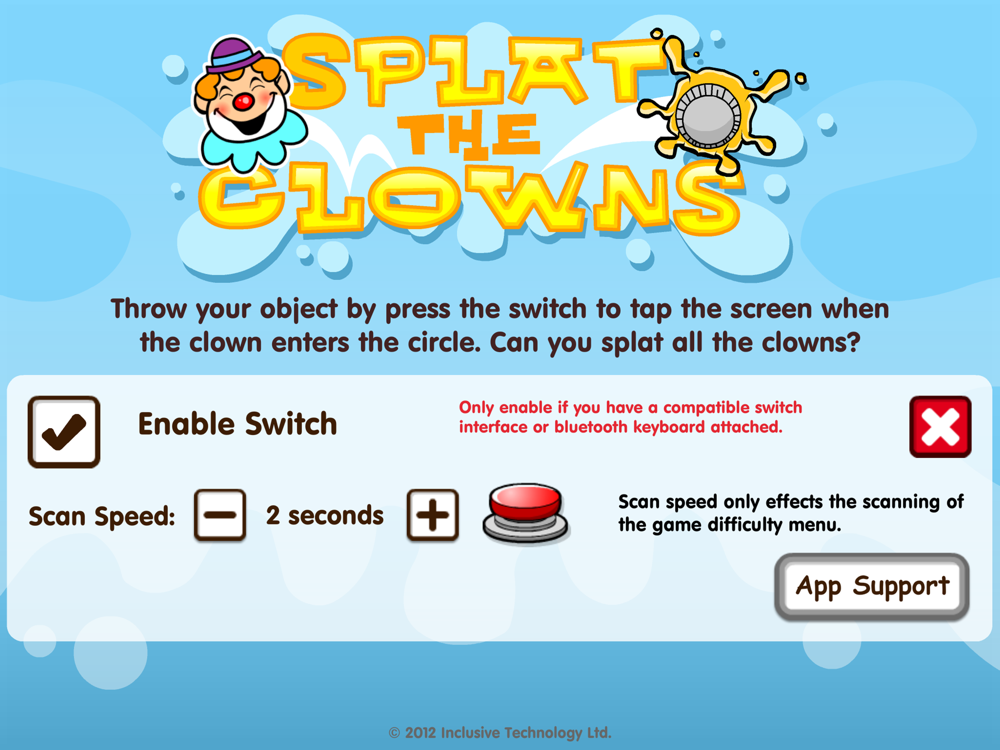 This accessible and inclusive game has been designed to encourage and develop hand-eye coordination and switch timing skills. Auditory prompts and a clear background with bright objects make this an ideal game for children with visual and perceptual difficulties. Choose the easy level and the clown will wait for you to throw! Switch input is accepted from all the currently available switch interfaces.