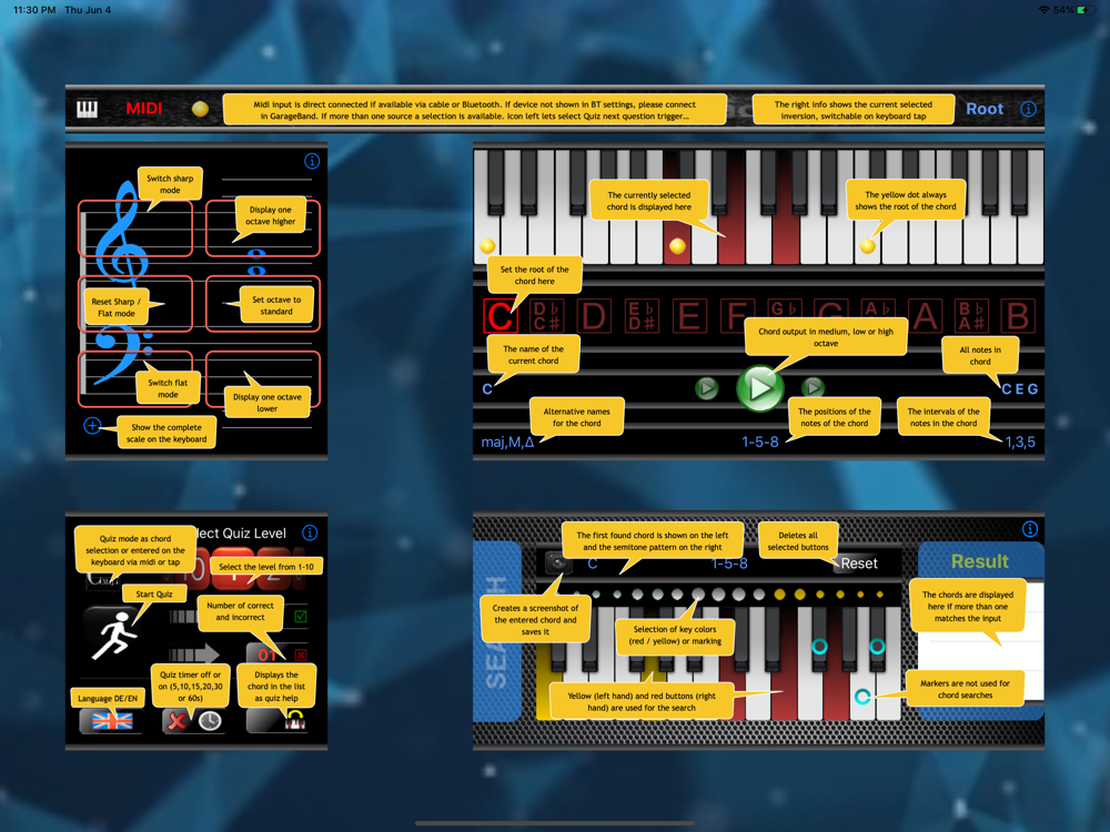 And after multiple requests now with midi input. A connected midi keyboard via cable or Bluetooth is recognized directly and you can use it in quiz mode and for reverse search. Some Bluetooth keyboards needs to be connected via GarageBand and can then be used. If there are several midi sources, a dialog is displayed for selection.