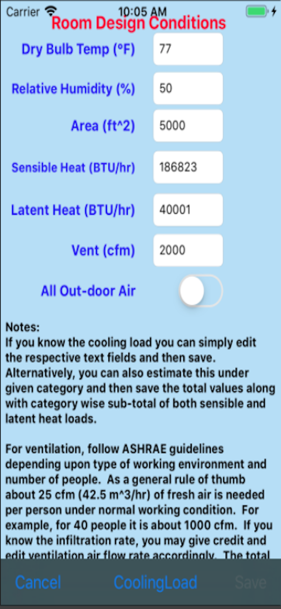For HVAC, a separate section has been added as a part of conditioned space for editing cooling and heating load under 10 major categories as shown in the screen shot. A separate computation button is provided for the users to select and compute load under each category by editing default parameters as per recommended practice. A comprehensive foot note is also provided under each category for proper editing and load computation.