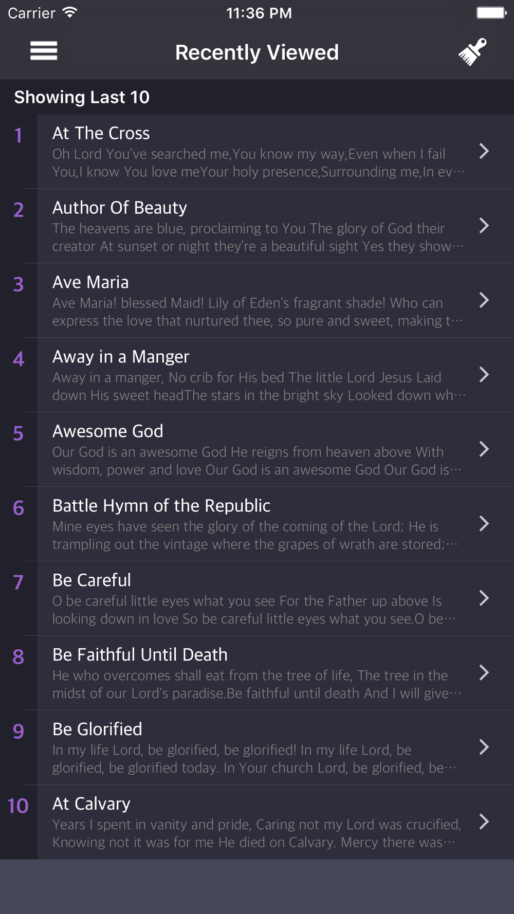 - Recently viewed hymns appear in a 'recents' section for easy reference