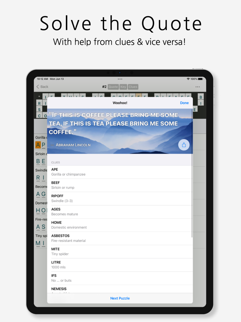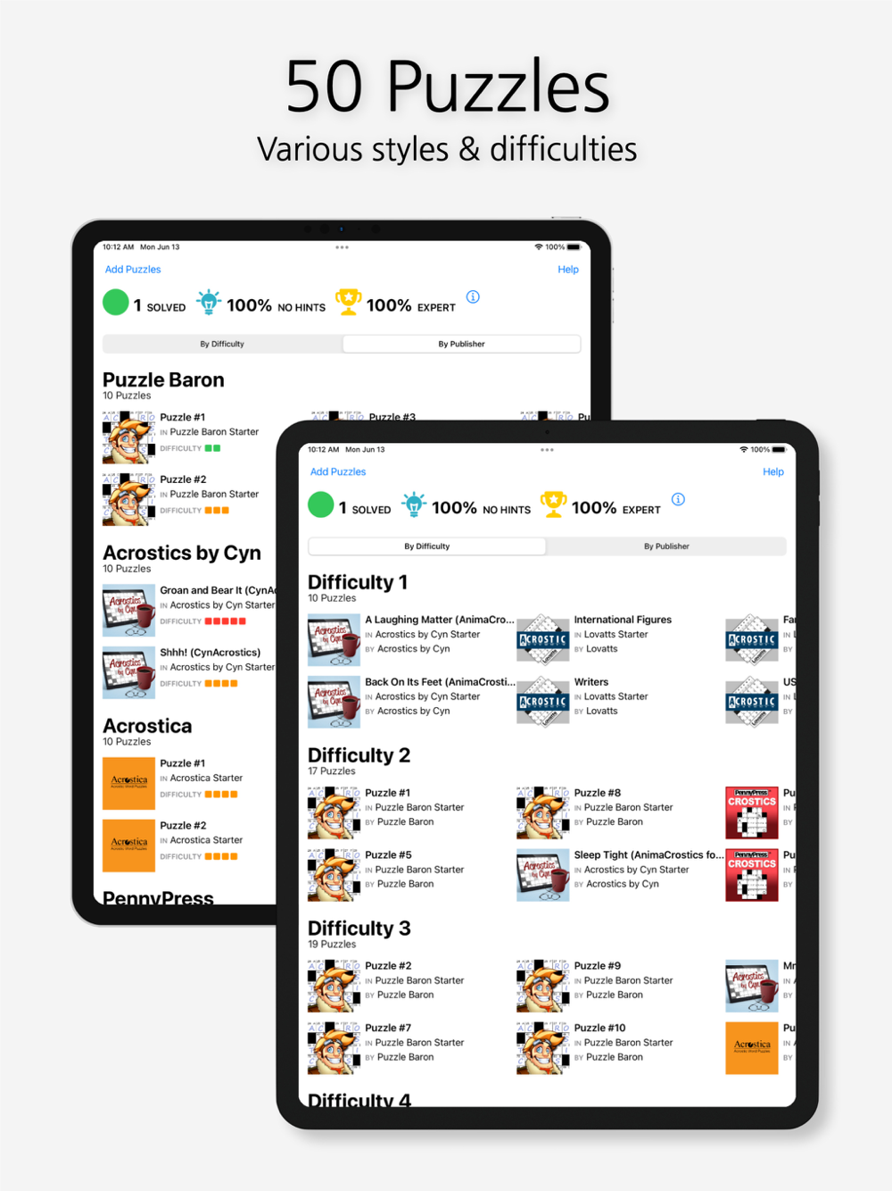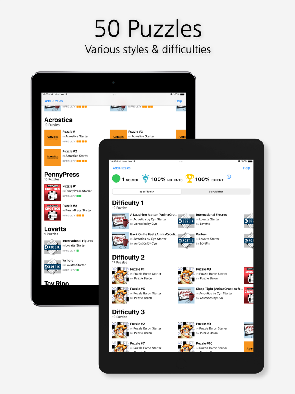 The app includes 60 free quality puzzles with no ads, ever. They range from beginner to expert from renowned publishers like Acrostica, Acrostics by Cyn, Lovatts Puzzles, PennyPress Crostics, Puzzle Baron and Spanish language puzzles from Tav Ripo. Additional puzzle packs containing 48 to 50 puzzles are available for a small fee; the full library is over 6350 puzzles!