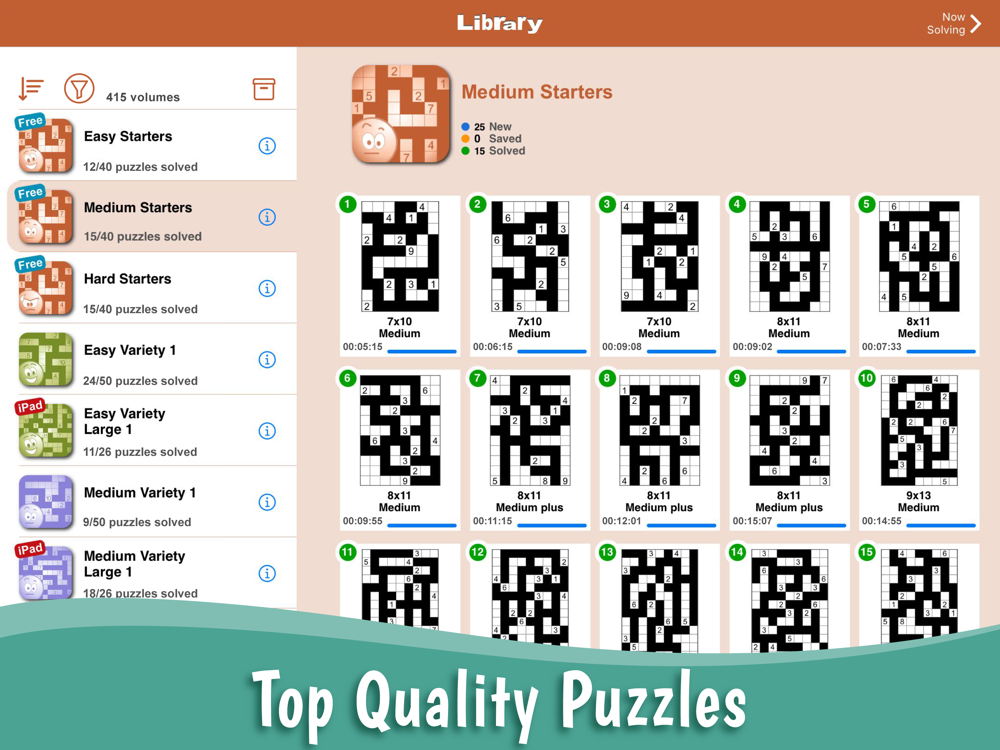 To help see the puzzle progress, graphic previews in the puzzle list show the progress of all puzzles in a volume as they are being solved. A Gallery view option provides these previews in a larger format.