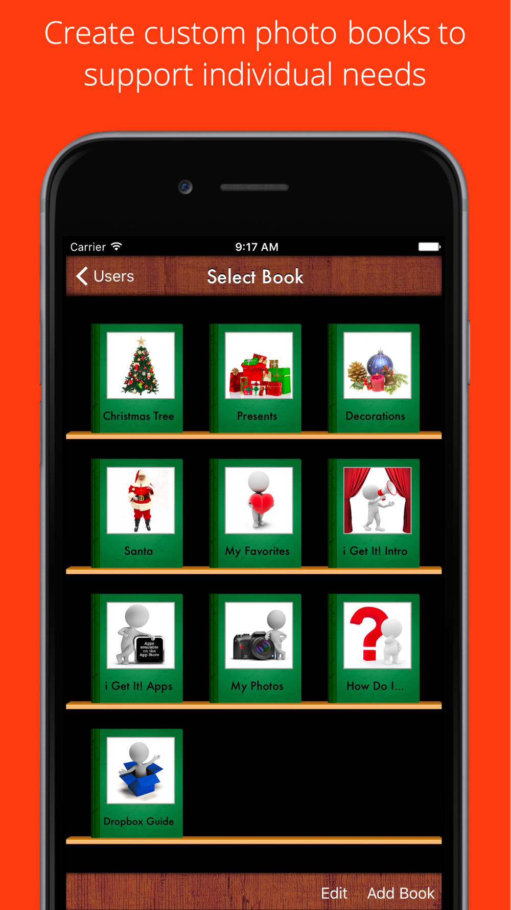 i Get… Christmas Vocabulary is an application designed in a photo album format to support individuals learning about things relative to Christmas. The ability to individualize all the pages with your own photos, titles, subtitles and audio, allows the app to be used for a variety of purposes, including receptive identification and expressive labeling.